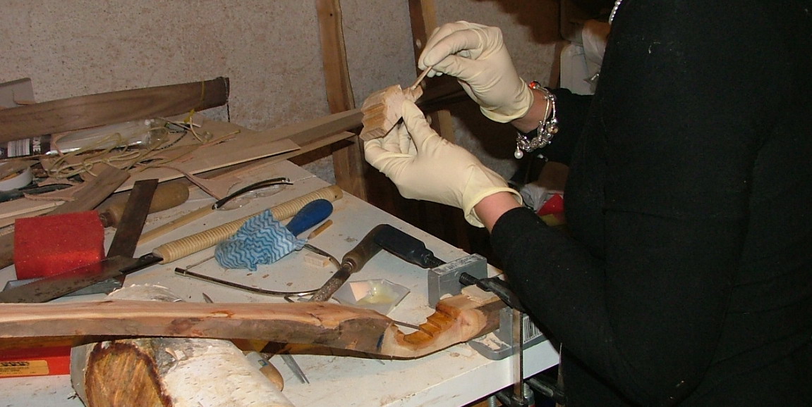 Der weitere Plan für Nr5 ist den 40 cm Abschnitt zu teilen, ein ca 20 cm langer Abschnitt wird zur Grundlage für das Griffstück, der andere Abschnitt soll zwei 20 cm Laminate ergeben die auf die inneren Wurfarmenden auflaminiert werden da die zu schwach sind. Diese sollen, die Teile der Wurfarme die Später ins Griffstück gesteckt werden stabilisieren und dann außerhalb des Griffstücks in Fades auslaufen. So hoffe ich verhindern zu können, dass an der Griffstückkante eine Sollbruchstelle entsteht. Die inneren Wurfarmenden werd ich dann ganz leicht konisch verschleifen und mit einer 9cm langen Manschette aus Epoxyleinen versehen. Das Griffstück wird an der Vorderseite den Wurfarmen angepasst, in der Mitte bleibt ein Schmaler Steg stehen der die Einstecktiefe der Wurfarme begrenzt. Dann werden die Griffstückmanschetten mit Trennmittel versehen und um den ganzen Griff mit den positionierten Wurfarmen Epoxyleinen gewickelt. Soweit die Theorie, wie das praktisch geht, na schauma mal...