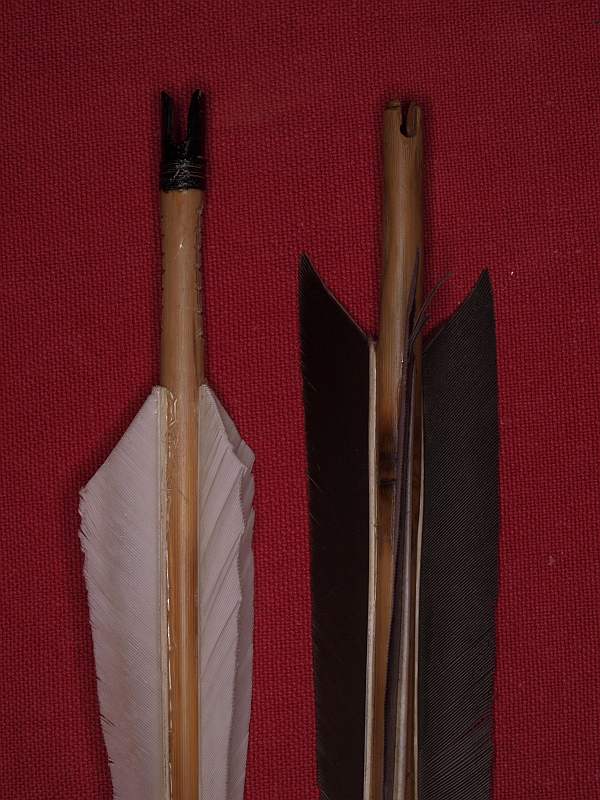 Links Reiterbogenpfeil aus Bambus, rechts Yumipfeil aus Bambus.