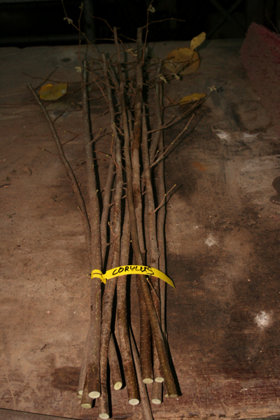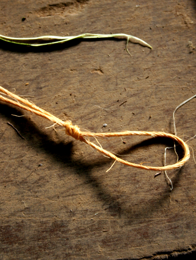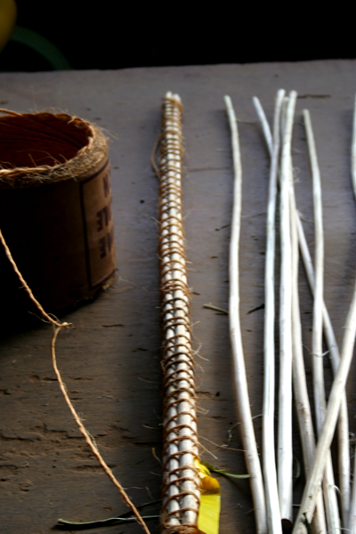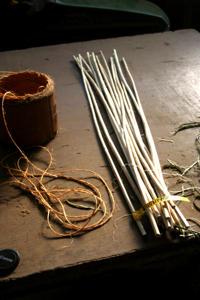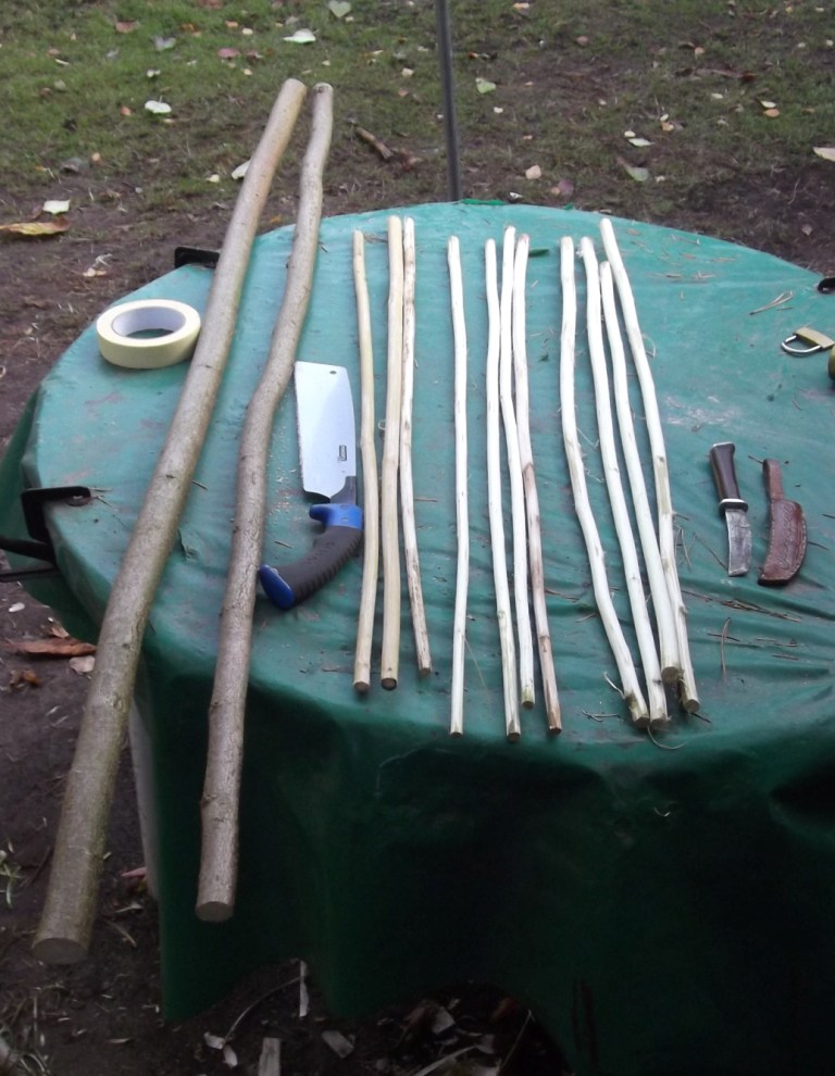 Der Rest ist eher langweilig. Man nehme einen Wildrosenbusch, eine alte Rosenzange, ein repariertes Küchenmesser und etwas Schnur. Die Einbuchtung im Messer ist sehr gut für das Entrinden von Schösslingen geeignet, musste ich feststellen.