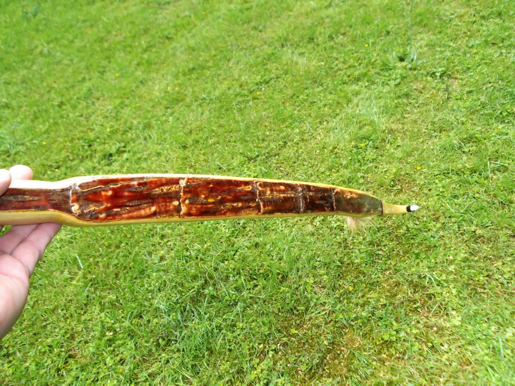 Das ist der etwas krumme obere Wurfarm. Bis jetzt sind ca 70 Pfeile geflogen, und ich hab ich bißschen Sorge dass er sch da weg dreht zu sehen ist davon noch nichts. Ausser dass die Sehne halt nicht mittig über den Arm läuft. Die rechte Sehnenkerbe hab ich etwas tiefer gemacht als die linke. Aber einen Effekt hab ich noch nicht festgestellt.