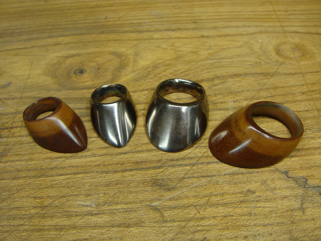 Und wir haben hier nun eine Serie vervielfältigbarer Ringe, von denen haben wir Gussformen und können sie einigermassen günstig in 10 Formen und in vielen Metallen giessen lassen - Bronze, Edelmetalle, Messing, Eisen, Edelstahl,...