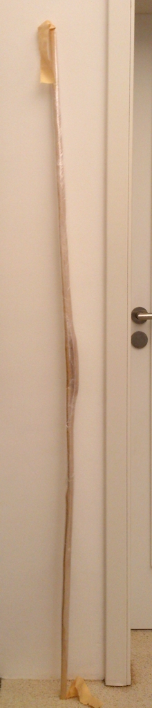 Heute habe ich dann die Bogenform fertig gemacht, den Rücken fein verschliffen und ein Seidenbacking aufgeklebt. Ich hatte nämlich bei dem Stück Holz direkt nach dem entrinden ziemlich viele Fehler im Rücken entdeckt und diese Stellen mit dem Schweifhobel entfernt und dabei auch den Rück plan gemacht. Und jetzt geh ich schnell den Rohling wieder auspacken, damit der Holzleim trocknen kann.