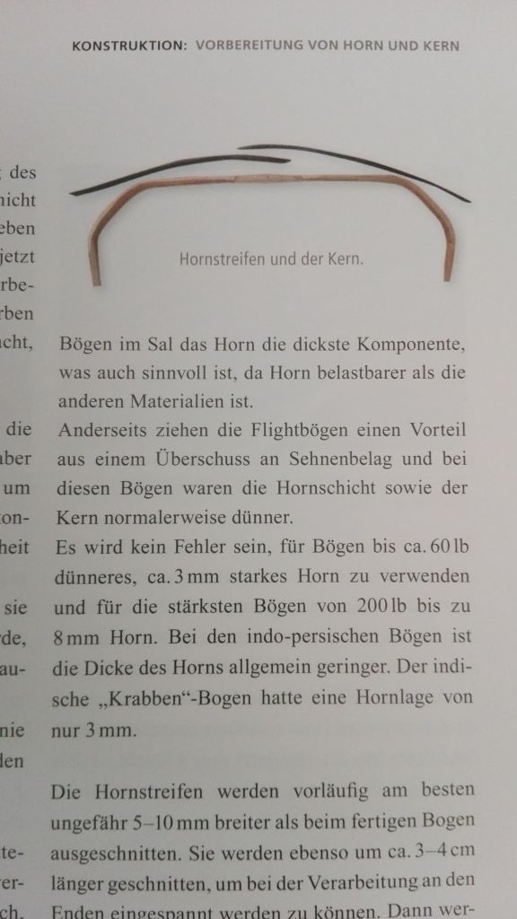 Hmm ich hatte nochmals Karpowicz zu diesem Thema gelesen. Auch er macht ein wenig gegensätzliche Aussagen was die dicke des Kern bzw. des Horn angehen. Auf der einen Seite sagt er, dass das Horn die Dickste Komponente sein soll oder ausgeglichen sein soll. Auf der anderen Seite soll man bei Bögen bis 60# 3mm Horn nehmen, da frag ich mich wie ich auf das Zuggewicht kommen soll ohne den Holzkern dicker zu machen! (siehe Bilder)