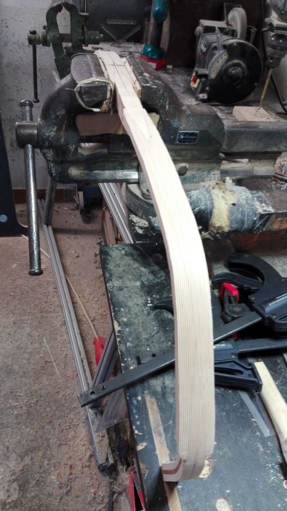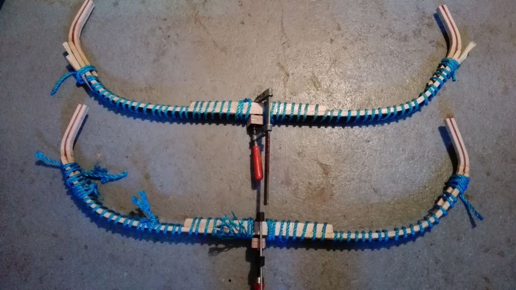 Ich habe die Rahmen fertig gemacht und geformt. Dabei habe ich die Kasane ein wenig vergrößert(weniger Biegezone= mehr Zuggewicht) und die Kerndicke ein wenig reduziert, sodass ich mit ein wenig mehr Sehne auf das gleiche Zuggewicht kommen müsste. Ich habe ja einen Bogen mit 116cm NtN und der andere ist 120cm NtN. Heute habe ich dem kleinen Bogen seine erste Lage Sehnen spendiert, der große hat seine erste Lage bereits 2Tage.