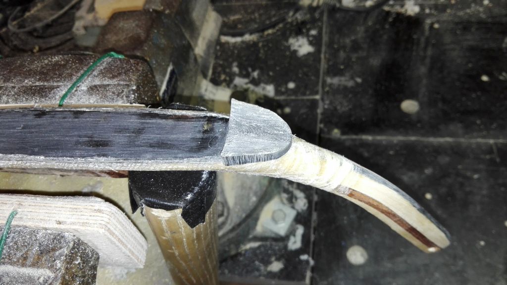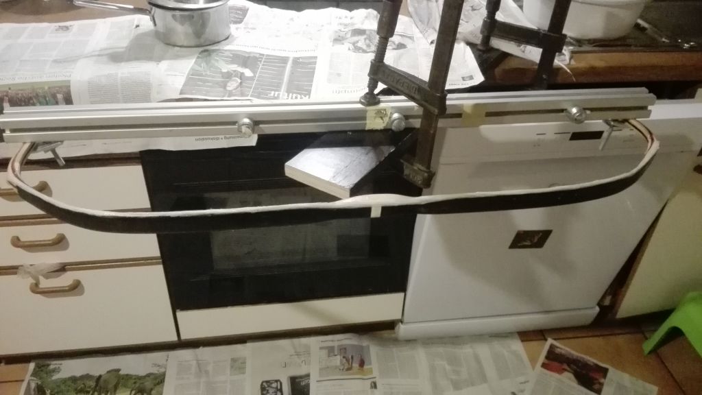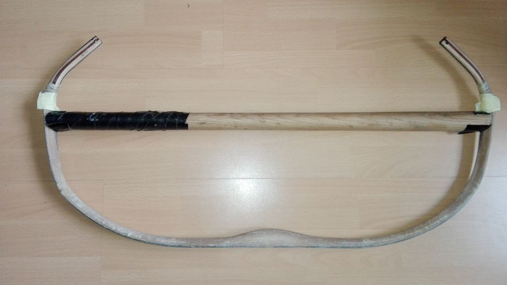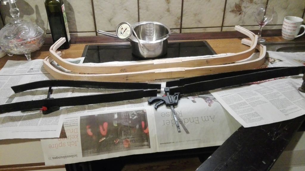 Ich habe letzte Woche Donnerstag das Horn aufgeklebt. Also Küche wieder auf über 30 °C geheizt und los gings. Vorher hatte ich die Rahmen mit etwas Überstand auf das Endmaß gebracht und in den Holzkern die Rillen eingeritzt. Die Fuge ist nun auch gewölbt. Danach alles grundiert und anschließend verleimt. War das anstrengend auf beiden Rahmen das Horn aufzubringen, aber nun habe ich es geschafft. Da ich bei dem alten Bogen das Horn entnommen habe und der Bogen über eine Woche im Wasser liegend gebraucht hatte um es abzubekommen, weiß ich nun, dass meine Hornverklebungen nicht schlecht sein können. In den nächsten Tagen wird es weiter gehen und ich werde den Kern modellieren.