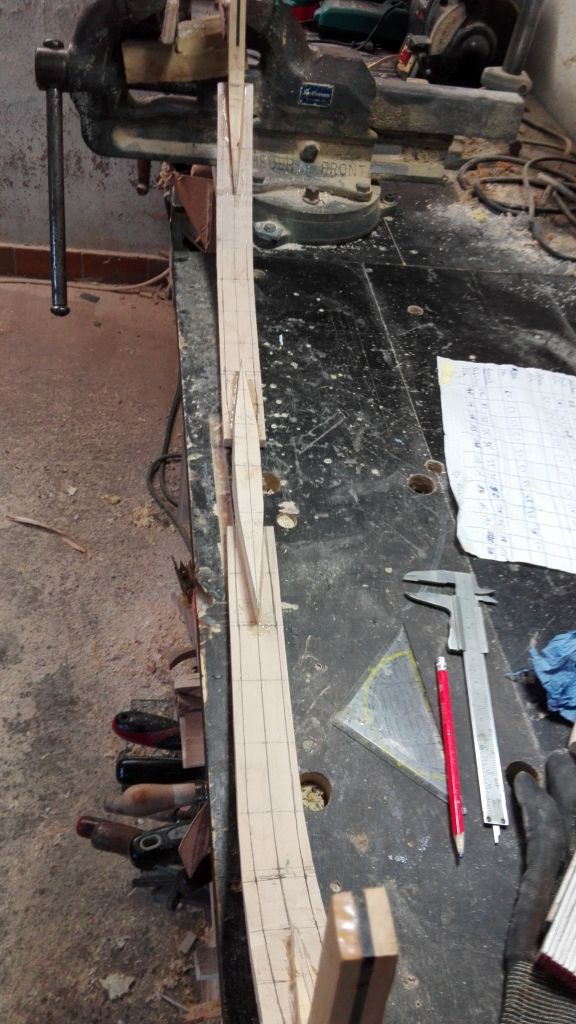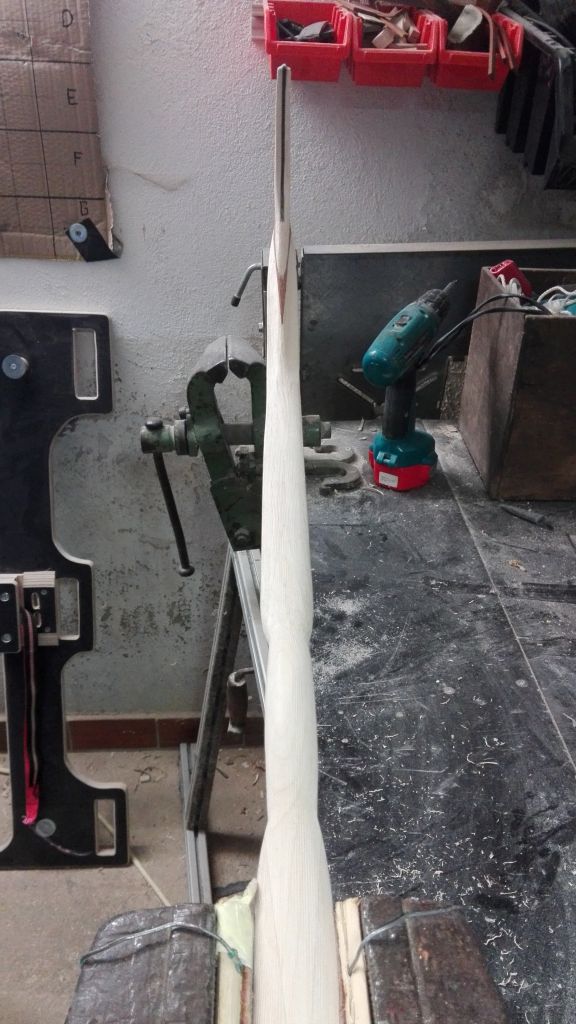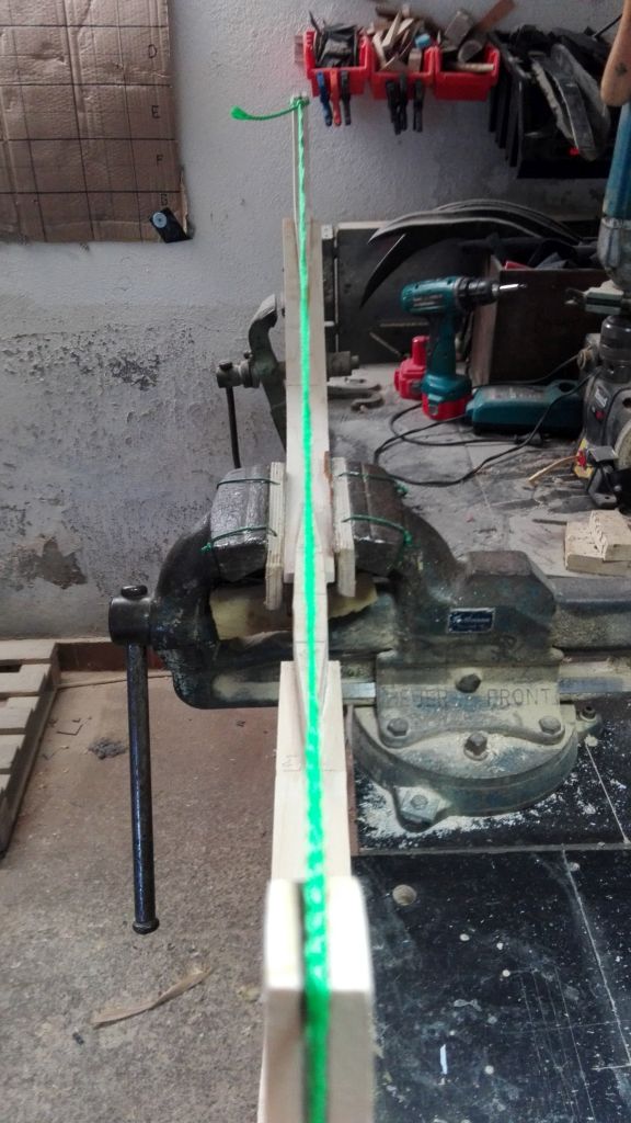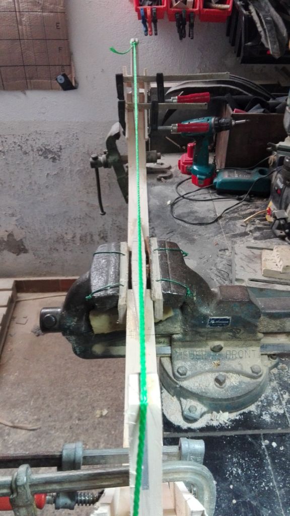 So trotz Rückschläge , die ich hier verkraften musste, gebe ich nicht auf und fange von vorne an. Ich habe mir überlegt wie ich Verdrehungen und leicht aus der Flucht gekommene Rahmen von Anfang an vermeiden kann. Ich habe mir ein Hilfsmittel gebaut, womit sich die Rahmen einspannen lassen und in aller Ruhe verklebt werden können. Auch habe ich die Griffspleiße in dieser Vorrichtung aufgezeichnet, so bleibt von allesschön gerade und an seinem Platz. Die Rahmen werden zwischen die beiden Hölzer mit Schraubzwingen geklemmt. Das eine Holz ist bereits mit von Anfang an mit Schrauben fixiert und das Zweite wird erst mit Schrauben fixiert , wenn der Rahmen mit den Schraubzwingen eingespannt ist und perfekt sitzt. Danach können die Schraubzwingen zu besseren Handhabung abgenommen werden. Zum verkleben kann nun der Griff heraus genommen und mit Hautleim bestrichen werden. Anschließend den Griff wieder einsetzen und mit Keilen richtig druck aufbauen, ohne das etwas wegrutscht. Die dürfen nun erst mal trocknen und dann geht's weiter... Ja ich weiß ich bin gaga 4 Komposit zur gleichen Zeit