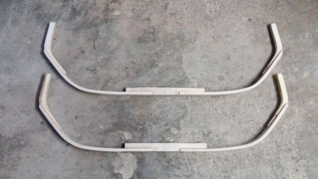 Gestern habe ich die Siyahs zusammen geklebt, d.h. ich habe natürlich gewachsene Siyahs in der Mitte aufgeschnitten und mit 4mm Kirsche und Büffelhorn zusammen geklebt. Die einen waren aus Apfelholz und die anderen aus Hasel. Die Hasel sind mit den gleichen Maßen 10g leichter als die Apfel ( Hasel 41g ; Apfel 51g). Das ist gerade bei Bögen mit leichtem Zuggewicht interessant. Alle 4 Siyahs haben den Belastungstest mit 80# bestanden. Des weiteren habe ich mit 4 Tools aus Holz gebaut, damit die Spleiße beim Festzwingen nicht mehr heraus rutschen. Das funktioniert wunderbar