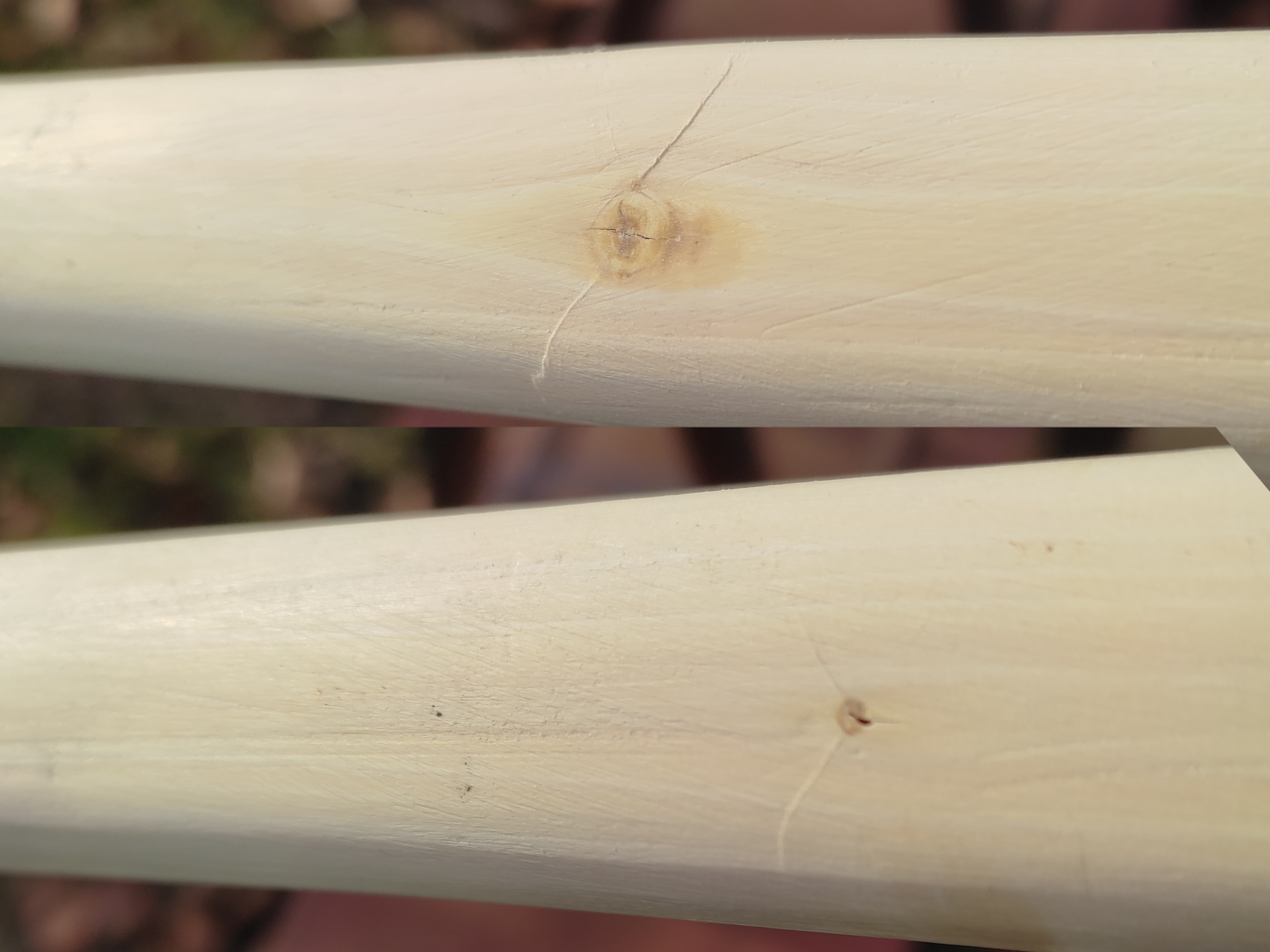 @Uranus: Mach doch folgendes: Holz für Griffstück ernten, vorzugsweise ca. 10 cm Durchmesser, spalten in Viertelscheiter, entrinden, grob zurechtsägen mit Übermaß (alle 4). Enden versiegeln, auf die Heizung. Nach 3 Tagen sind die Teile trocken und meist etwas gerissen. Das beste Stück auswählen. Nun auf Maß sägen und tapern. Falls doch noch ein Riss zutage trat: ignorieren bzw. unter Leder verschwinden lassen. Nimm eine Holzart, die nicht so leicht reißt: Hasel, Schwarzpappel, Birke, Erle.