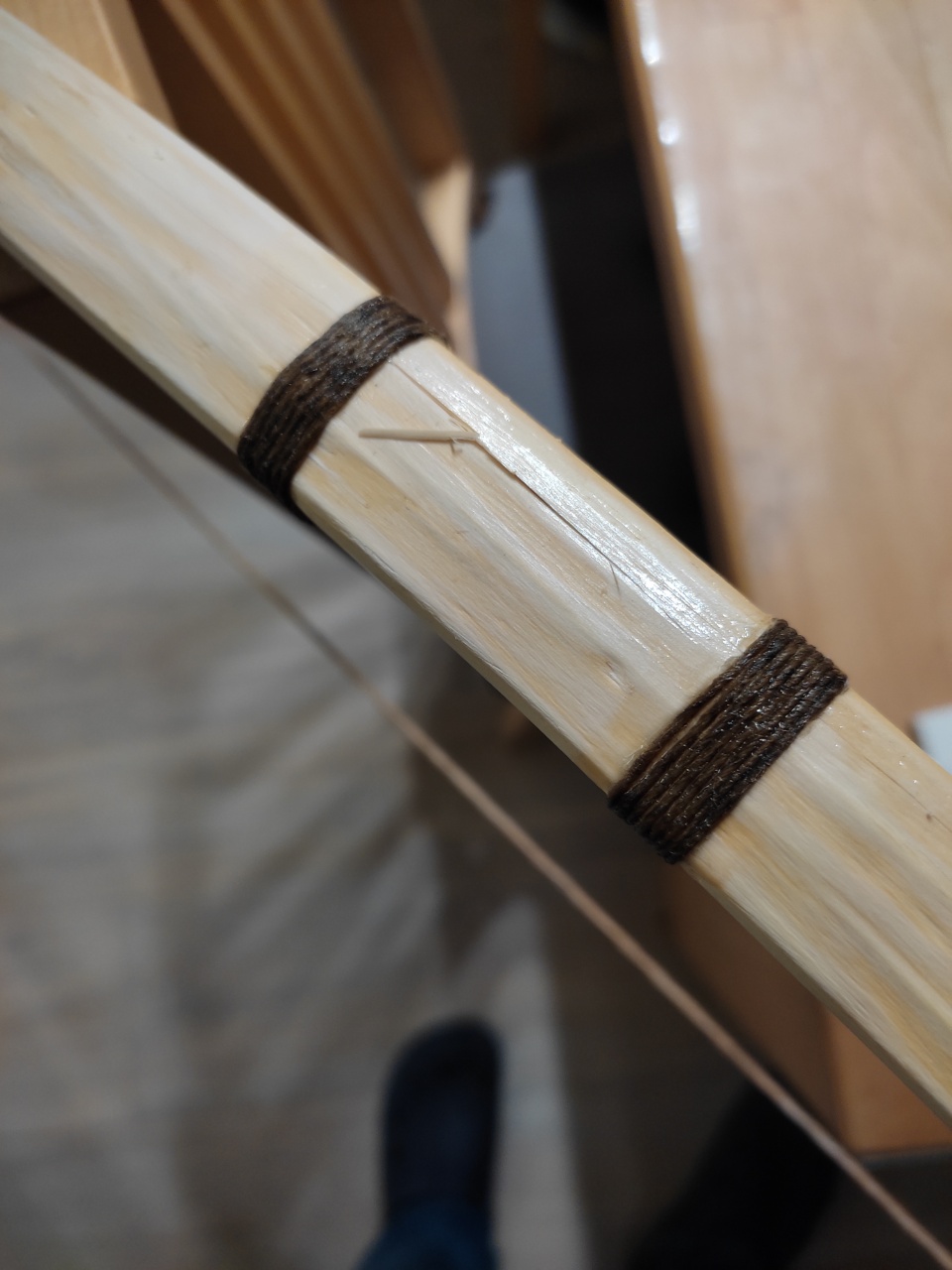 Der Riss oben kommt, weil ich den Bogen nicht passend mit der Faser ausgeschnitten habe, man sieht den Verlauf und den Riß: