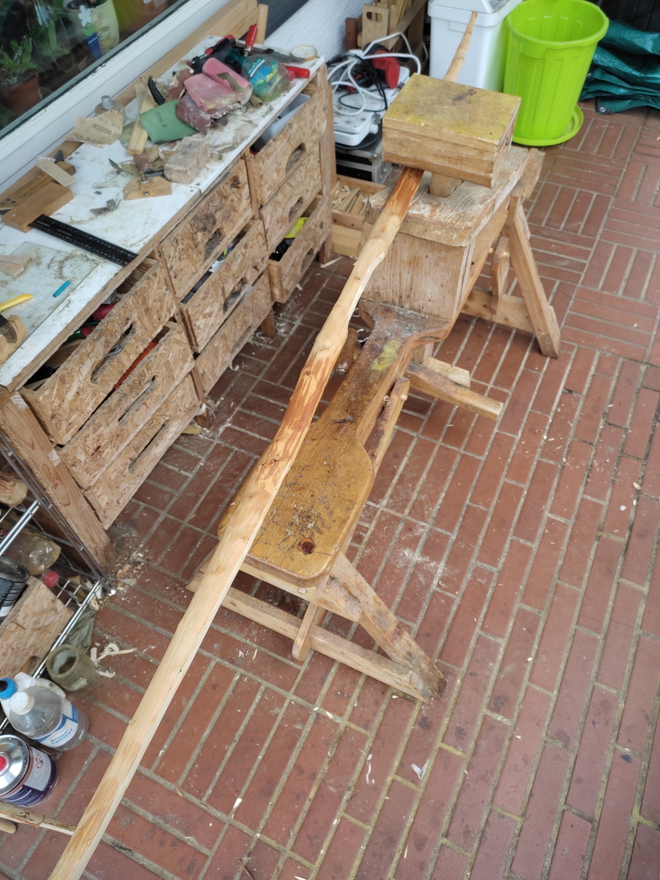 Tja ich hab noch ein Stück Kirschpflaume da und als Griffstück vorbereitet, zumindest versucht. Durch den Ast wurde das aber nichts. Da Griffhölzer frisch geerntet sein müssen, bleibt mir als Option höchstens noch, den Griffbereich des Hartriegels zu planieren. Das wird mir aber zu aufwendig und knapp, von da her ist mit der Kirschpflaume für den Wettbewerb Schluß. Ein Bogen fertig, einer nur 102 Schuß, einer wird nix und einer vielleicht später ...