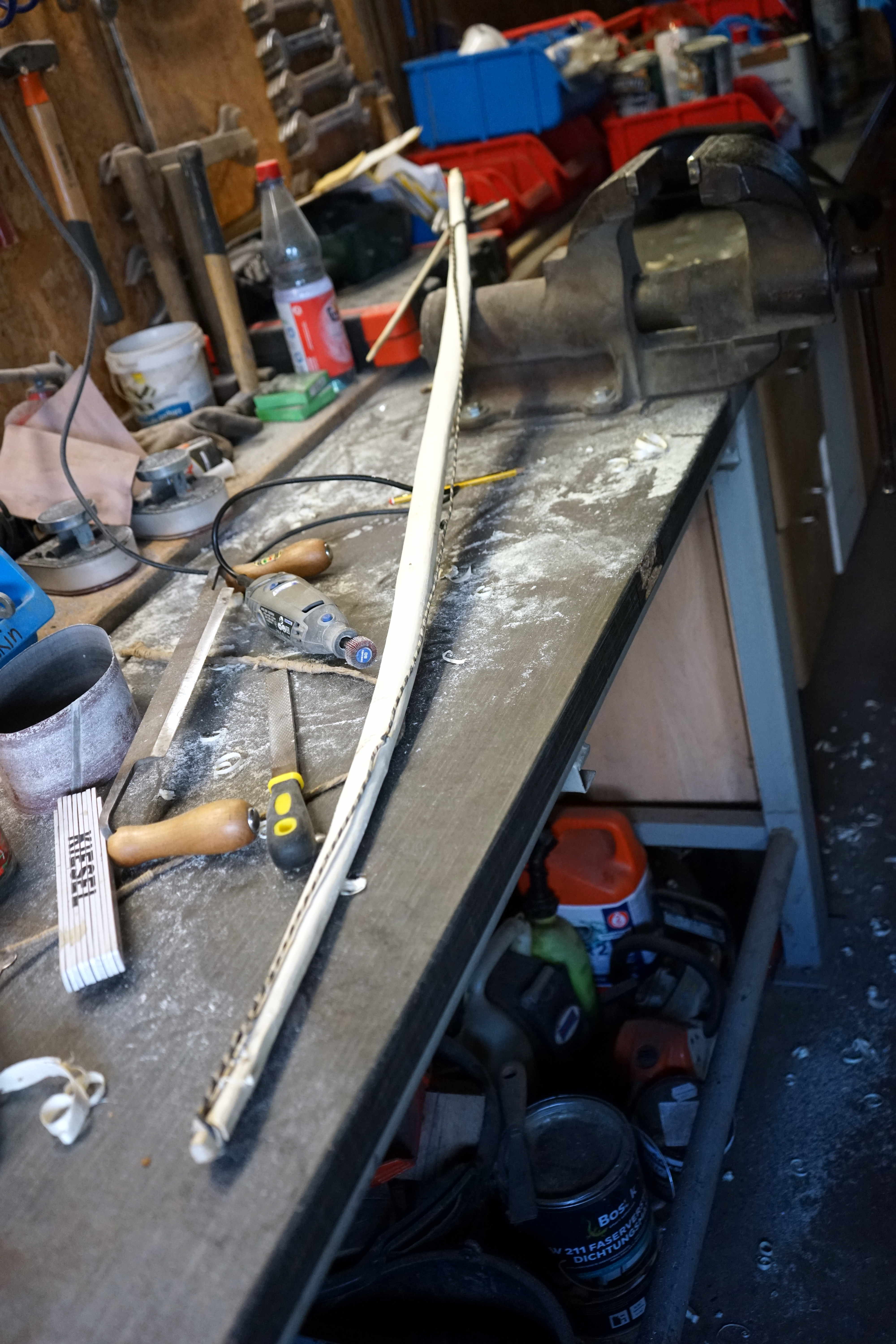 Werkzeug: Zugmesser, Raspel, Dremel (Schleiffächer), Opinel