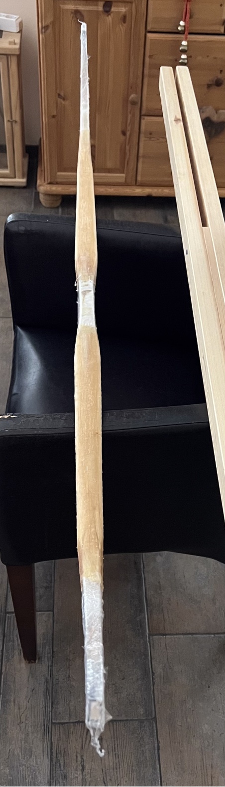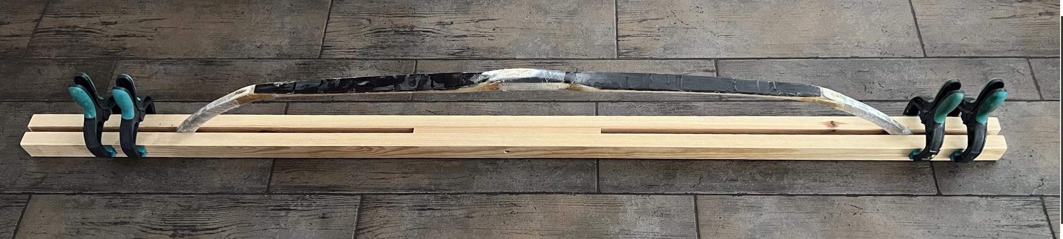 Heute die getrockneten Rindenabschnitte zurechtgeschnitten, geschliffen, gewässert, dann den Bogen bis 400 geschliffen, entstaubt, den Sehnenbelag mit heißem Wasser eingestrichen, dann Hasenhautleim auf Bogen und Rindenabschnitte aufgebracht, gelieren lassen, auflegen, ausstreichen, anwickeln mit Paketfolie, dann 4 Lagen Hosengummi Stoß auf Stoß und ab in die Sauna 55 Grad für eine Stunde, morgen auswickeln. Bin gespannt auf das Ergebnis, habe ich noch nie gemacht