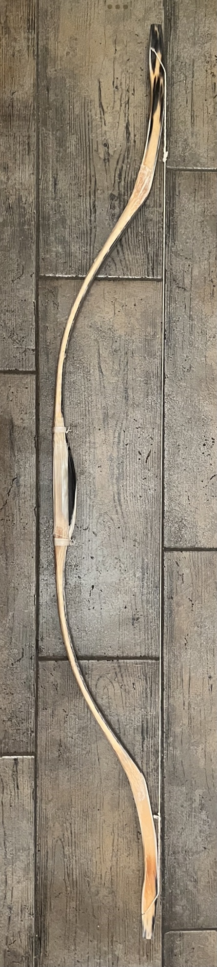 Habe heute zu tillern begonnen, da der Bogen 2Tage bei 622g konstant geblieben ist. Ich habe den Bogen mittels Durchsteigmethode aufgespannt und dann schrittweise die Standhöhe erhöht, dabei immer mit dem Schleifklotz den Hornbauch entsprechend reduziert, die Sehne läuft schön mittig und die Standhöhe beträgt bereits 12cm, angepeilt sind 16cm, Zuggewicht noch jenseits der 55 Pfund (Neumi und Hieronymus werden darüber nur schmunzeln) aber es ist auch sehr kalt in der Werkstatt, im Bereich der Fadeouts habe ich den Sehnenbelag mit einer provisorischen Wicklung gesichert. Jetzt kurz Rasten (Ich und der Bogen), dann weiter Tillern, Standhöhe erhöhen und die Syjahs verschmälern. Wunsch Zuggewicht ca. 45 Pfund.