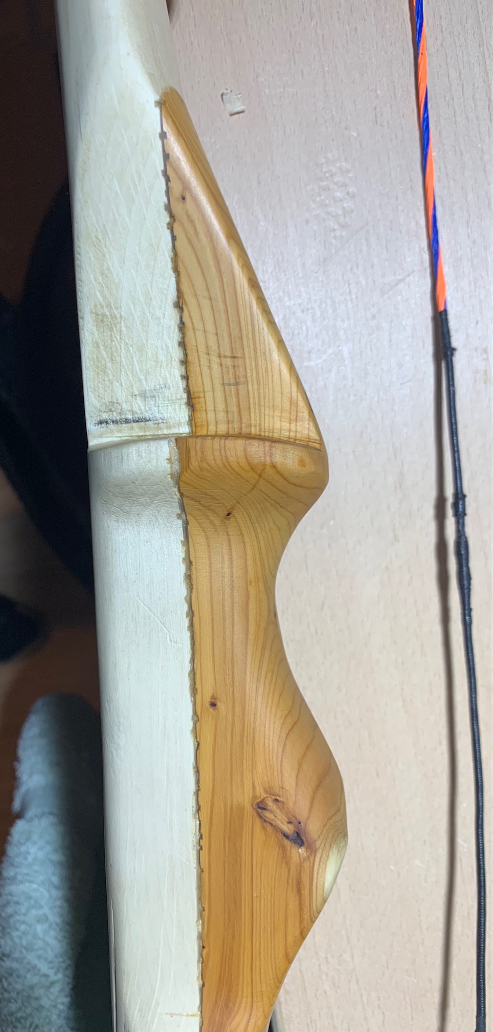 Ich würde so viel vom Griff wegnehmen dass die Mulde weg ist, ihn soweit schmälern dass er noch steif bleibt, von der Pfeilauflage so viel wie möglich wegnehmen und dann die schöne Klebefuge mit Leder verschönern...