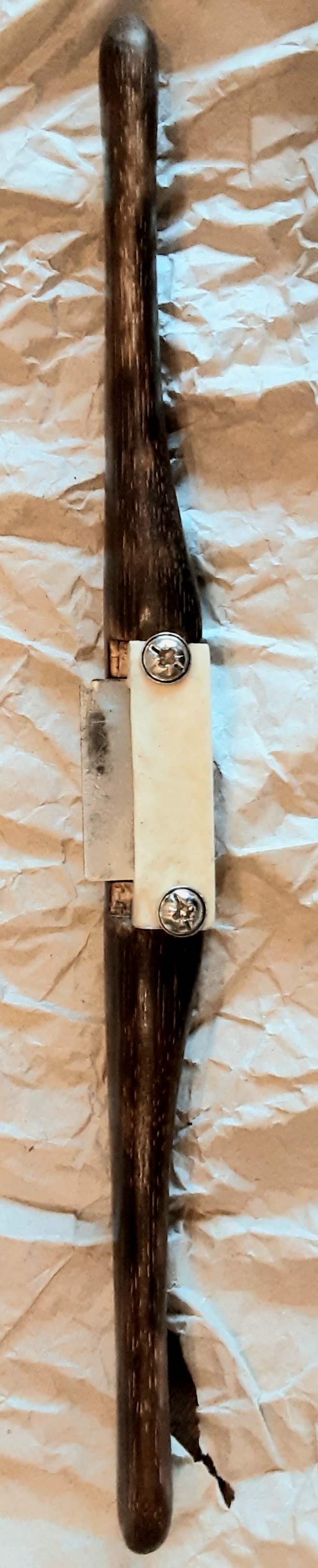 Das Hobelmaul ist aus nem Stück Knochen und der restliche Hobelkörper ist geflämmtes und geburnishtes Hickory ( auf den Bilder ist der Hobel noch nicht lackiert!). Das Hobelmaul ist ca. 3mm breit.