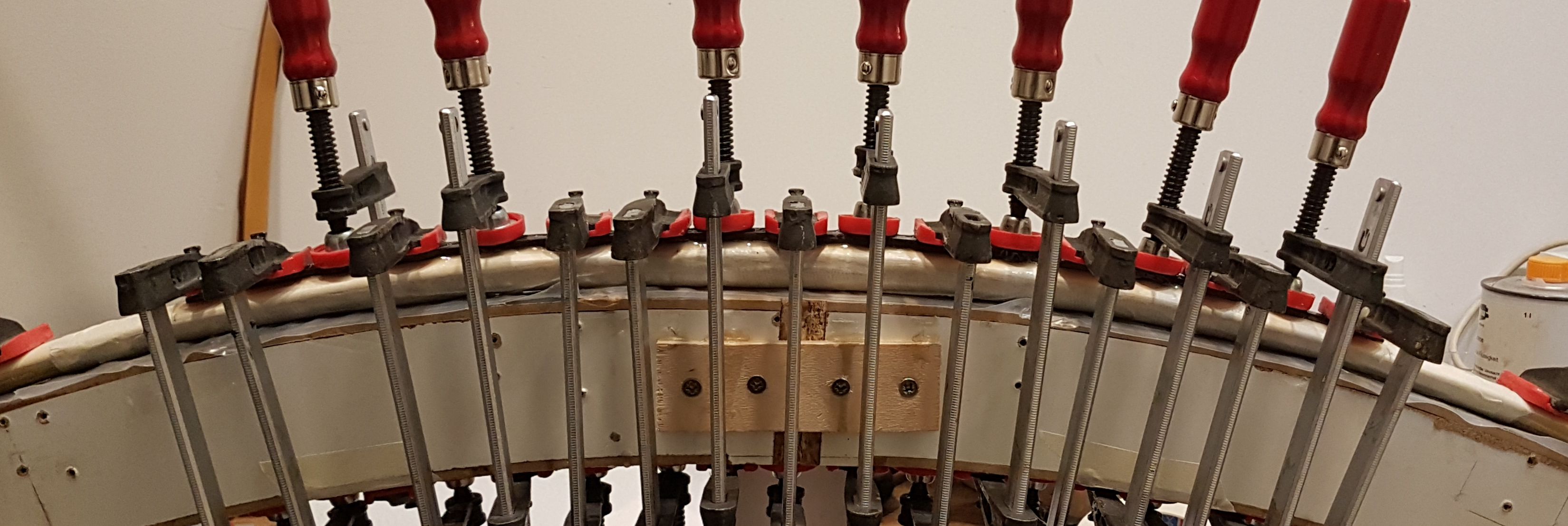 Wie dem auch sei - ich habe die Mitte zurecht gebogen und wieder einmal ein Experiment gestartet. Ich habe einige Horn-Seitenteile rumliegen und einige Streifen geschnitten, getestet ob die Dinger die erforderliche Biegung mitmachen und etliche in die Tonne geschickt. Aber zwei Teile finde ich OK, also habe ich die Dinger etwas begradigt, zueinander passend geschliffen und gegenläufig auf den Bauch geklebt. Die Streifen sind zusammen max. 12 mm breit und max 5 mm dick. Die Länge ist 50 cm. Mal sehn ob der Kleber das mitmacht. Eigentlich wollte ich bei diesem Bogen kein Epoxid einsetzen, Glutinleim war mit aber zu aufwendig.