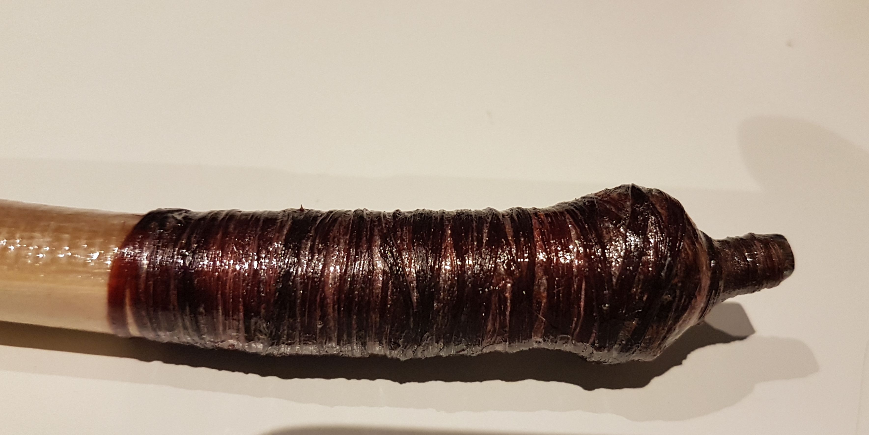 Außerdem habe ich schnell 3 kurze Stückchen Rohhaut ca. 7 mm breit geschnitten und eine 3-Strang Testsehne gewickelt, damit ich mal weiß wie dick sowas wird.