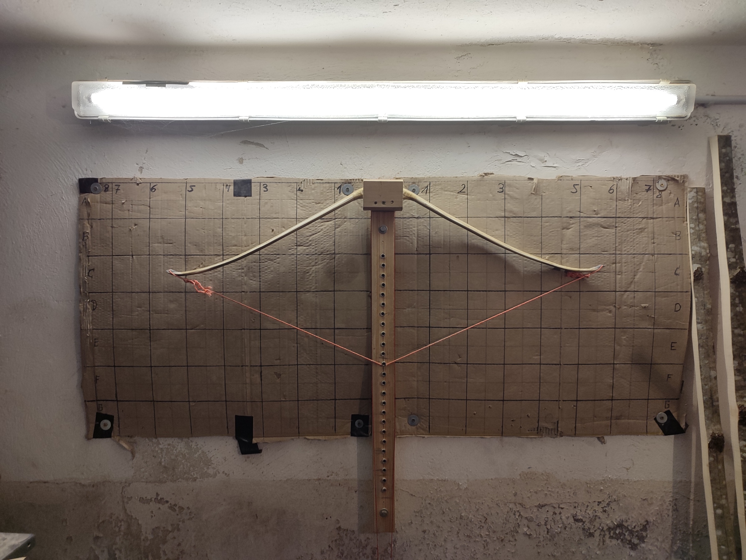 So heute ging es weiter. Den Bogen soweit vor getillert und auf Standhöhe gebracht. Es braucht noch ein wenig Korrekturen, aber im Großen und Ganzen sieht das schon ziemlich gut aus. Von den ersten Messungen werde ich min. Bei 60# landen...also alles läuft wie es soll... Der Bogen wiegt nun 345g