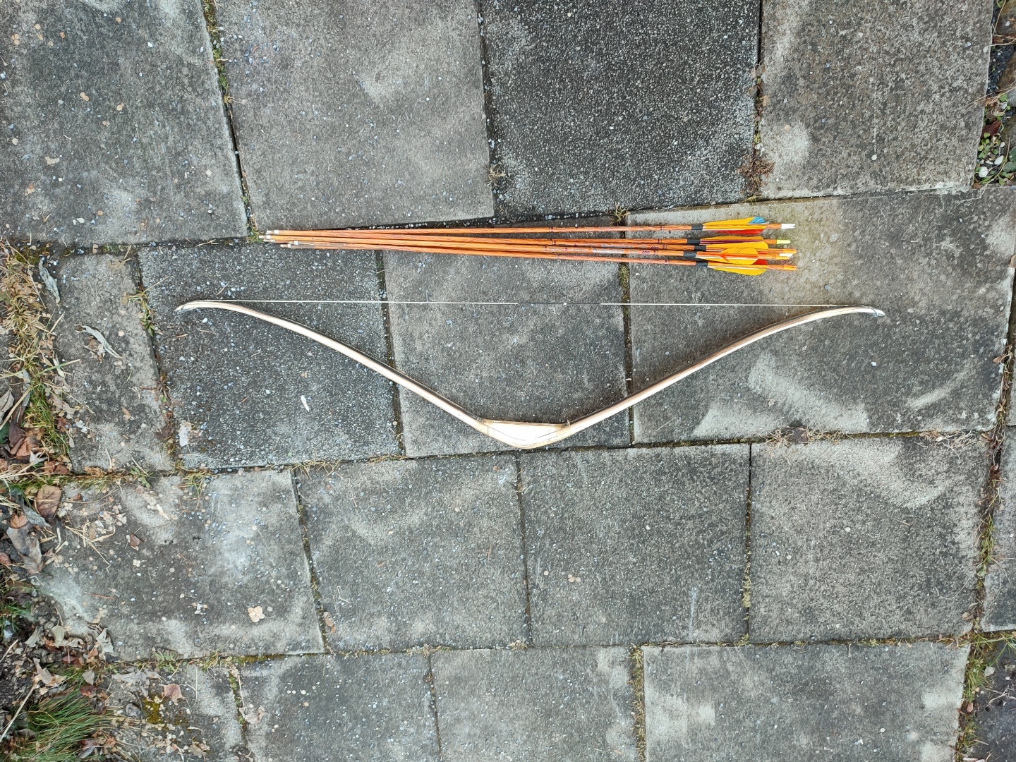 Der Bogen hat bei 60#@32'' und wiegt 340g mit Sehne.