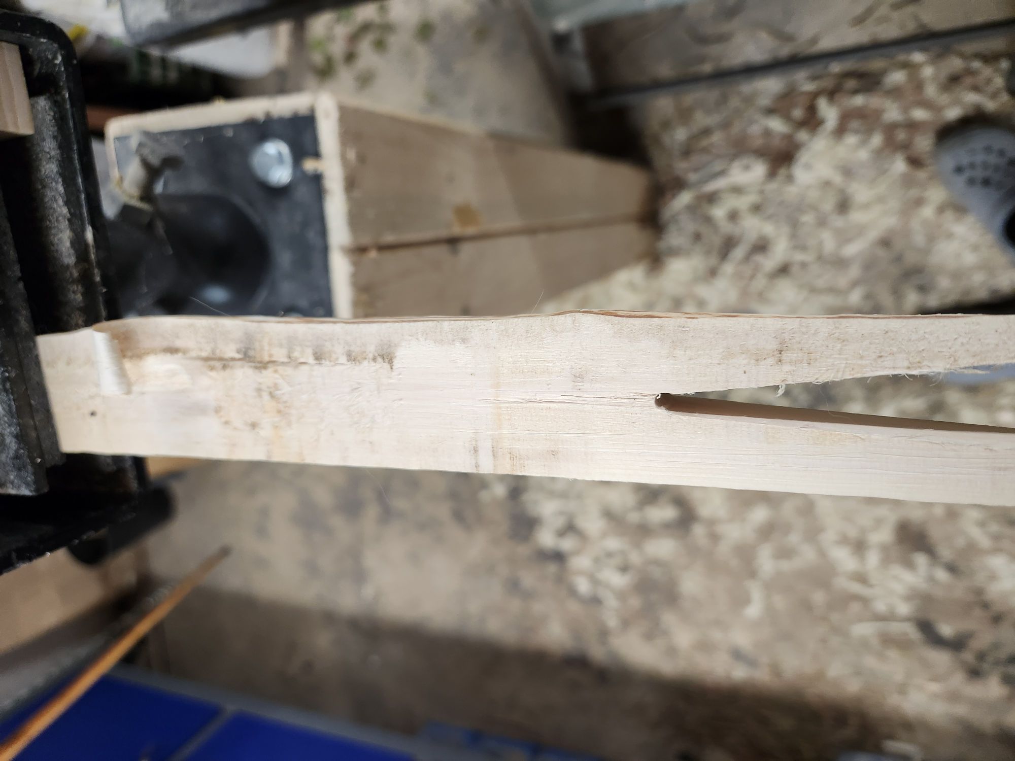 Vorgestern hatte ich den Bogen etwas im Schraubstock getillert und danach gewogen. Gestern hatte der Bogen nach 24h 1 Gramm zugelegt. Ich hab dann ein wenig weiter getillert und hab ihn dann mal auf geringer Standhöhe aufgespannt. Nach dem einhengen des Öhrchens ganz langsam nachgelassen weil sich die Schnur die ich da verwende ziemlich stark dehnt und der Bogen etwas umschlaggefährdet ist. Der hat die Sehne dann irgendwie ziemlich weit seitlich vom Griff nach vorn gezogen weshalb ich dann wie Schnur gleich wieder abgespannt hab. Dabei hat es mir die Sehnenlage aber total zu nichte gemacht. Den hats seitlich ziemlich stark verzogen