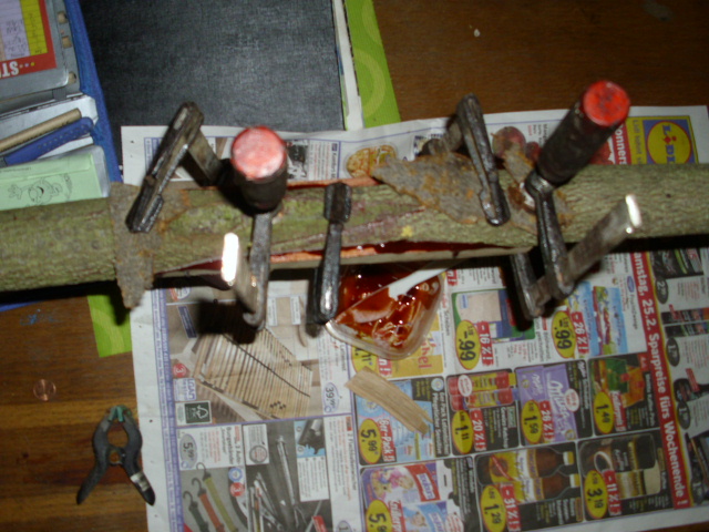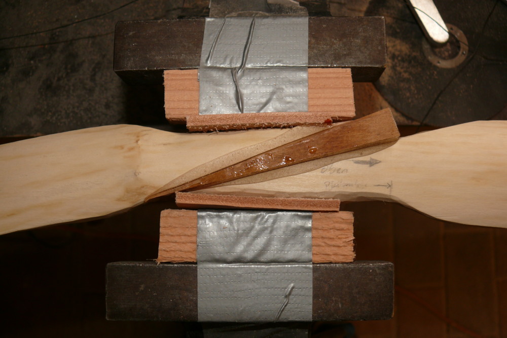 ...gebohrt und verstiftet (3mm Buchen- Schaschlikspiesse), damit da nix verrutscht......reichlich Epoxy druff und ab in´n Schraubstock...etwas beigeschnitzt/ geschliffen...Sehnenlage aktuell ..und nu noch ´ne stramme Hanf-Wicklung drum, weil besser is das... und morgen wird getillert was das Zeug hält