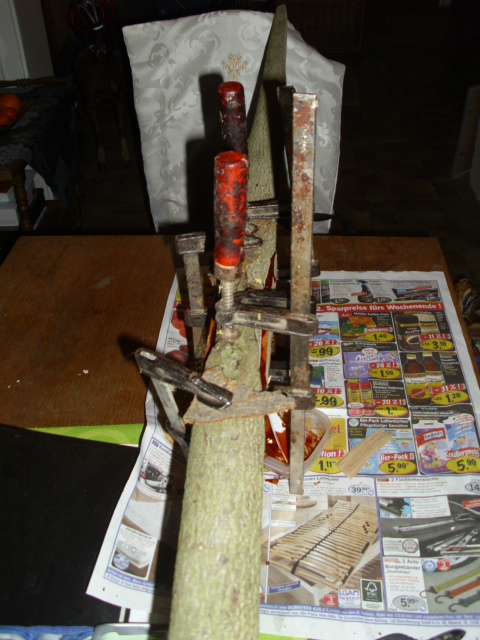Werkzeuge: Bandsäge, Bohrmaschine(3mm), Epoxy, Schraubstock, Messer, Schleifleinen, Hanfgarn, Leinolfirnis..(in der Reihenfolge)