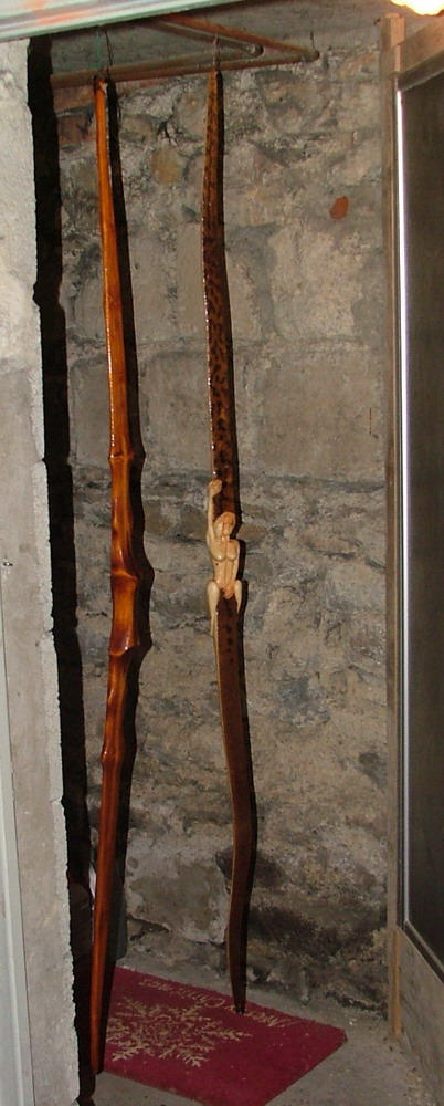So wird das nichts. Der Drehwuchs ist einfach zu stark. Anfangs bogen sich die Wurfarme so weit zur Seite, das die Sehne immer an der Unterarm schlagen musste. Durch asymmetrisches Abtragen an den WA konnte ich die Sehne zwar wieder über den Griff bekommen, aber die WA verdrehten doch sehr stark. Am Ende waren die Wurfarmenden je um ca. 40- 45° zum Griff gedreht. Das liegt zum Teil am Drehwuchs, zum Teil aber auch an der Wuchsform als ganzes, da die Enden nicht in der Flucht des Griffes liegen. Der größte Zug lag also auf einem sehr schmalen Grat an der Seite des Wurfarms. Das kann nicht auf Dauer gut gehen. Also, da hilft nur ein neuer Anlauf. Ich verzichte auf alle Sicherheitsreserven und kürze den Bogen um 12 cm auf 170cm und tillere noch mal von vorne los. Diesmal mache ich den Bauch absolut flach, das kann verdrehen und seitwärts weg biegen mindern. Andererseits ist das Bearbeiten von ganz flachen Bogeninnenseiten aufwendiger als bei leicht gewölbten Bäuchen.