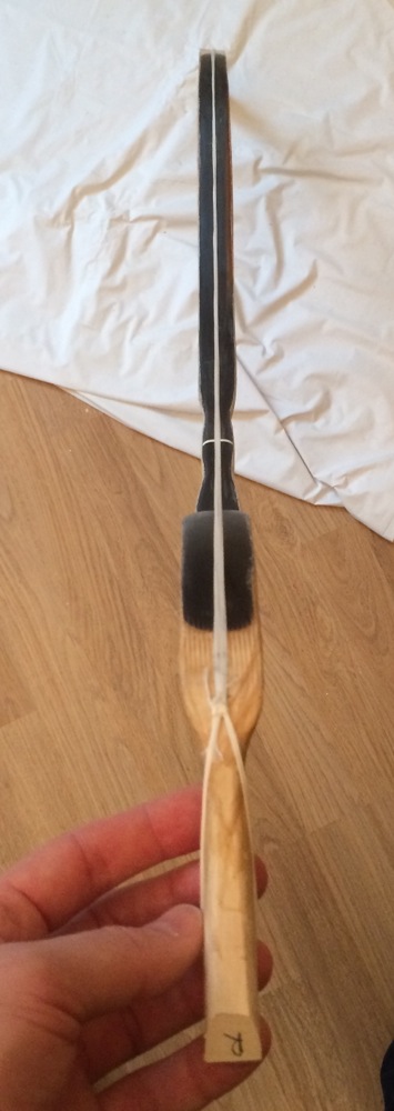 Auf dem Standhöhe Bild sehe ich, das sich der Bogen insgesamt etwa im Gleichgewicht zu befinden scheint. Die Ursache, warum die Enden unterschiedlich aussehen/stehen sehe ich darin, das im Übergang vom Wurfarm zum Siyah (heißt das Kasan? bin nicht sicher) bzw kurz davor, der linke WA eine Spur weicher zu sein scheint. Auf Standhöhe ist deshalb der rechte WA in dem Bereich mehr reflex. Das zeigt sich dann in den unterschiedlichen Winkeln.