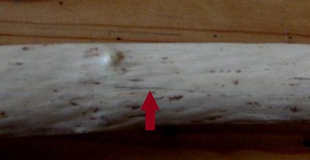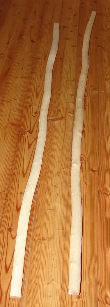 Meine Hartriegel wurden nach dem Spalten etwa 1 Woche im freien gelagert, dann entrindet und 1 weitere Woche im Freien getrocknet. Leider hat sich bei einer Sapling-Hälfte an einem Totast ein langer Riss gebildet. 2 Stück ohne Risse trocknen seitdem im Haus und verlieren noch immer etwa 1,3 % Masse/Tag. Zwischendurch wurden sie immer wieder mit einer Heißluftpistole gerichtet, wobei ich bei einem etwas zu viel Biegung herausbekommen wollte und sich am Rücken ein Span abgehoben hat: Beim anderen war ich etwas vorsichtiger und habe nur so viel gerichtet, dass Tips und Griff auf einer Linie liegen.