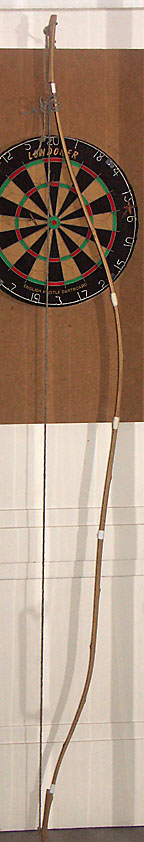 Da die Bambuslatten aber nicht ganz gerade waren, hat der Bogen schon ohne mein Zutun ein Iriki bekommen. Das hoffe ich so wieder heraus zu bekommen. Er reagiert auch auf das Holz. Wenn ich das Holz heraus nehme ist er, über die Sehne geguckt, völlig gerade. Damit der gewünschte Deki hinein kommt wird es ein, zwei Tage brauchen. Kann sein, dass ich mit etwas Wärme nachhelfen muss.