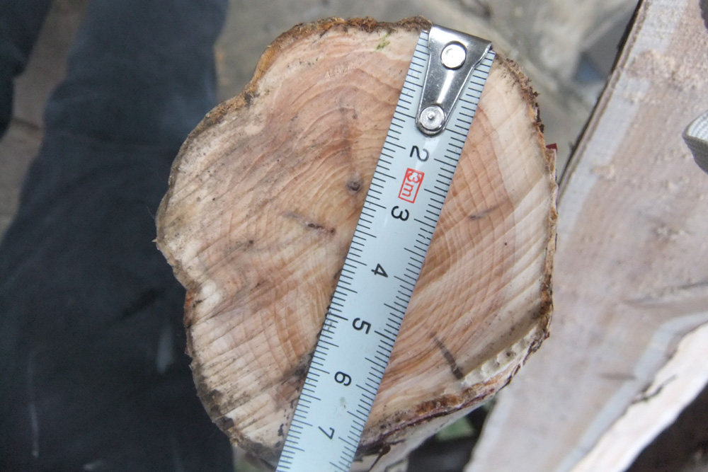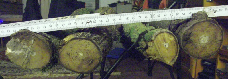 6-8cm dick, ein Stämmchen wurde direkt auf der Bandsäge halbiert