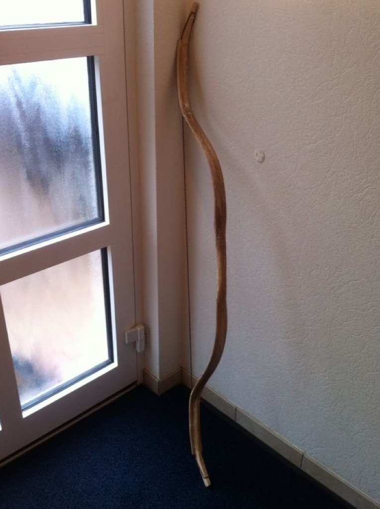 Ich habe den Bogen nun das erste mal aufgespannt, um die Biegung der Wurfarme zu überprüfen und sie gegebenenfalls mit zusätzlicher Sehne auszubessern. Dies war allerdings nicht nötig