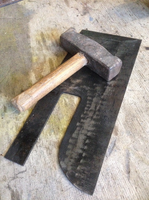 Zum Biegen mit dem Hammer würde ich einen schweren Fäustel wählen und mir dazu einen Holzklotz zurechtmachen, der etwa die selbe Grösse hat wie der Fäustelkopf. Dann kommt die Klinge auf eine schwere Unterlage - Hackstock oder so...