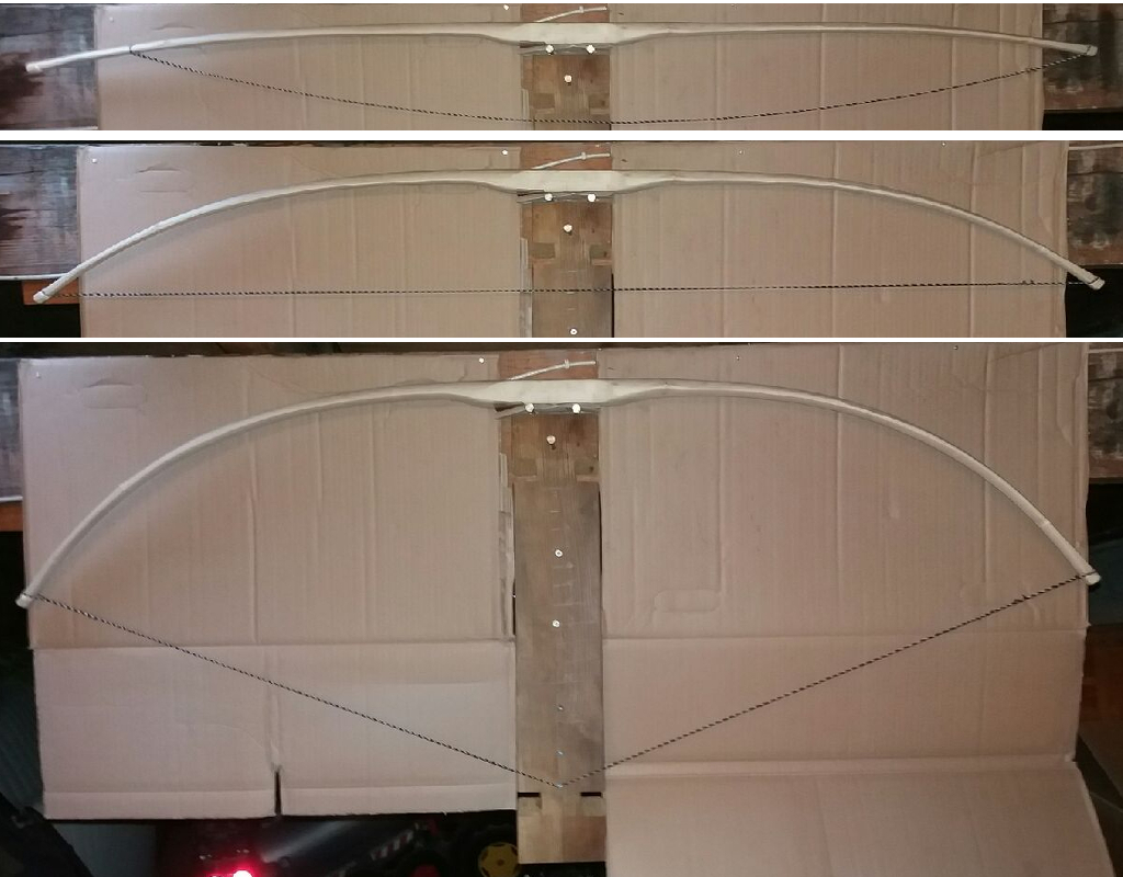 Ich hab jetz penibel drauf geachtet, dass ich an der Sehnenmitte aufspanne, tatsächlich ist dann der Bogen etwas nach rechts gekippt. Diese Kippung hab ich noch mit einem kleinen Kartonstreifen unterstützt dass der Druck etwa gleich auf dem Griff lastet. Das ganze sieht jetzt alles etwas harmonischer aus (s. Bildchen unten (ich hab mit Assistentin fotographiert und max 2 Sekunden eingehakt)).