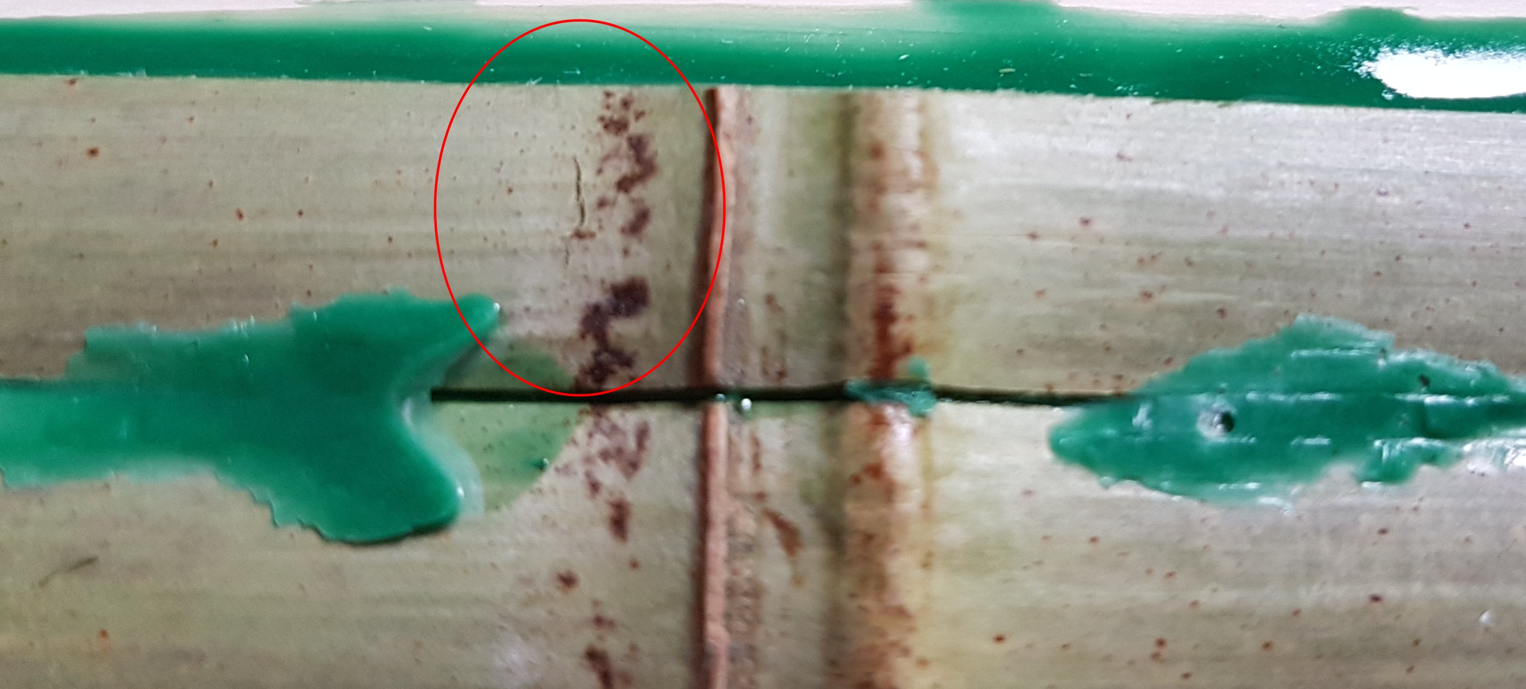 Musste erstmal nachdenken und den Fehler analysieren. Ich werde die zweite Hälfte dieser Bambus-Stange als Backing benutzen, geteilt wie zuvor. Allerdings werde ich die Bambuslage so dick wie möglich machen, auch weil mir das Zuggewicht zu niedrig war (ich schieße eigentlich keine Bogen unter 70-75#). Denn der Bambus sieht im Bereich der Internodien eigentlich ziemlich gut aus (unten nochmal Fotos). Wie und ob ich dann die Schwachstellen zusätzlich verstärke, überlege ich noch.