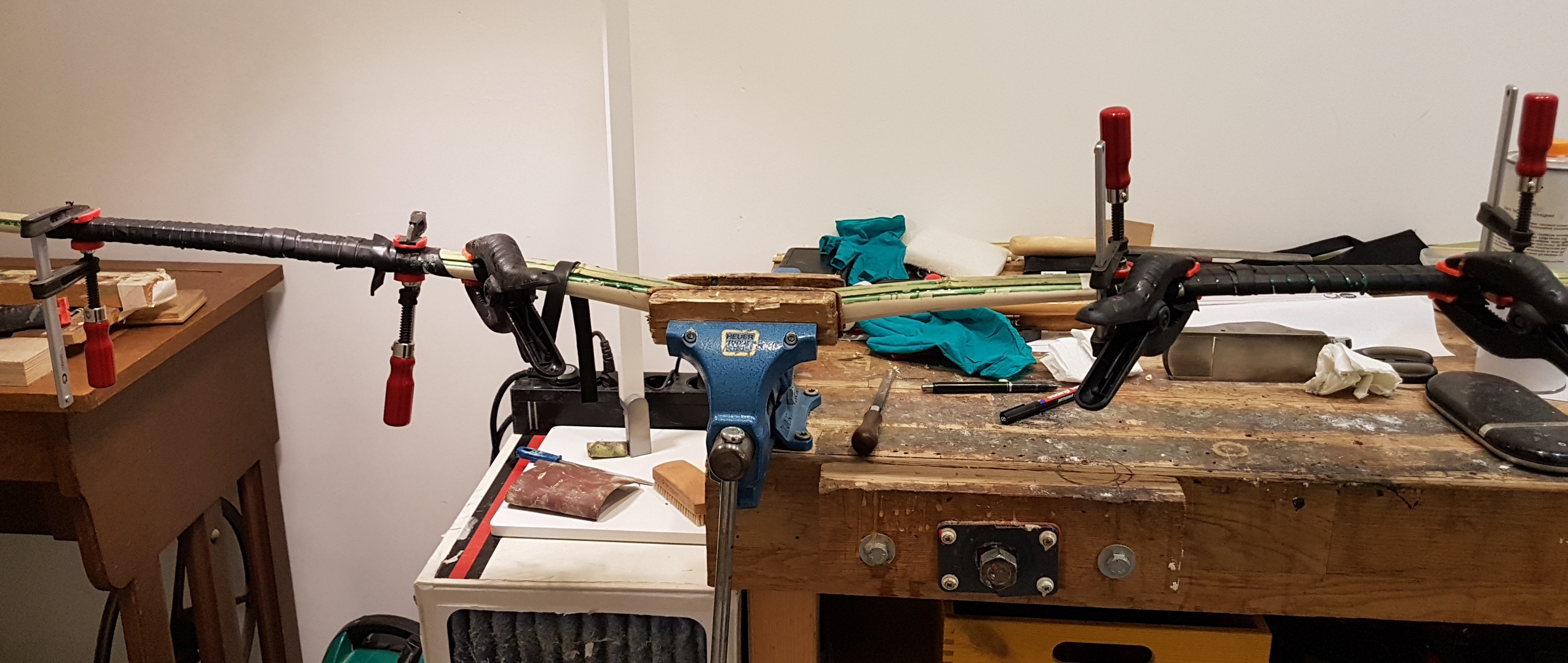 Ich habe zunächst mal ohne Kleber geschaut wie ich das Backing auf den Bogenrohling bekomme und wie ich die Zwingen setzen muss, damit ich das Konstrukt irgendwie noch in die Klebeform bekomme. Zum einen ist jede Menge des ursprünglichen Reflex weg, zum anderen habe ich den zusätzlichen Griffaufbau, der bei der Klebeform nicht berücksichtigt ist. Außerdem ist das Konstrukt jetzt nicht mehr eckig und hat seinen Seitentaper - alles Dinge die es schwierig machen das Backing mittig aufzukleben und das auch noch mit einer Form die nicht richtig passt.
