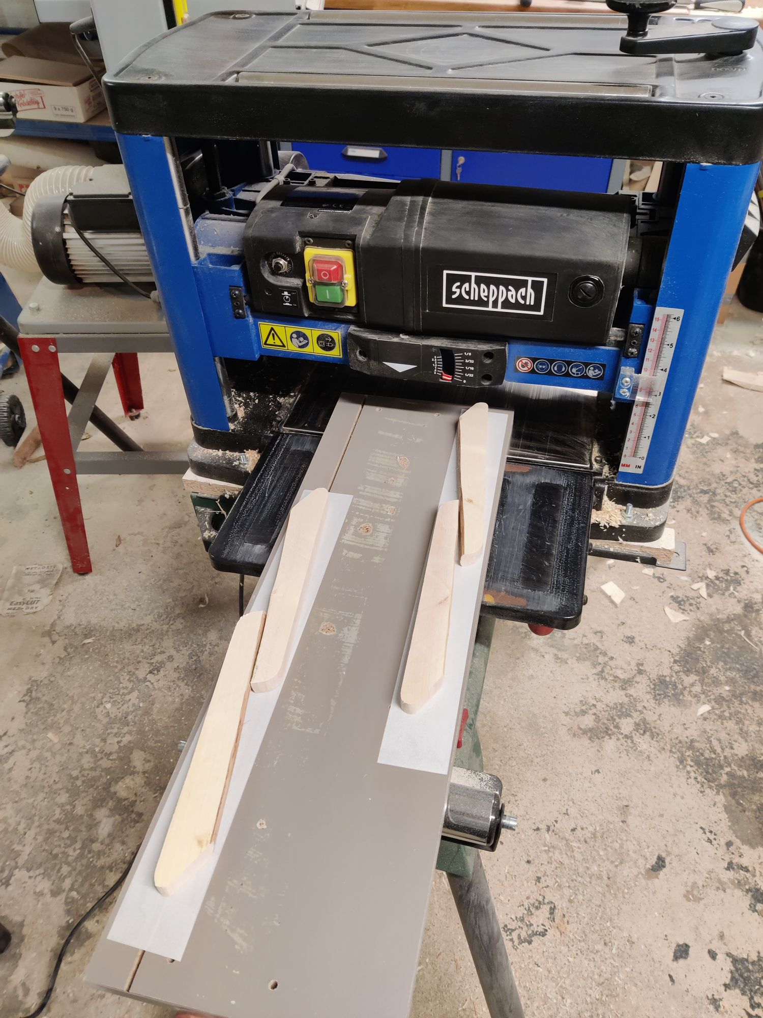 Heute gings an den Dickenhobel. Alle 4 Recurves auf ein Brett geklebt und von beiden Seiten gehobelt bis ich 12mm dicke hatte. Dabei waren die Haselrecurves weiter vorne und hinten aufgeklebt um den Hobelschlag abzufangen. Der ist aber so gering ausgefallen dass ich die Haselrecurves als Backup problemlos benutzen könnte.