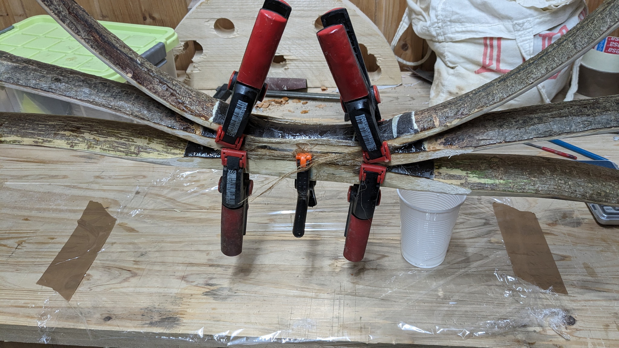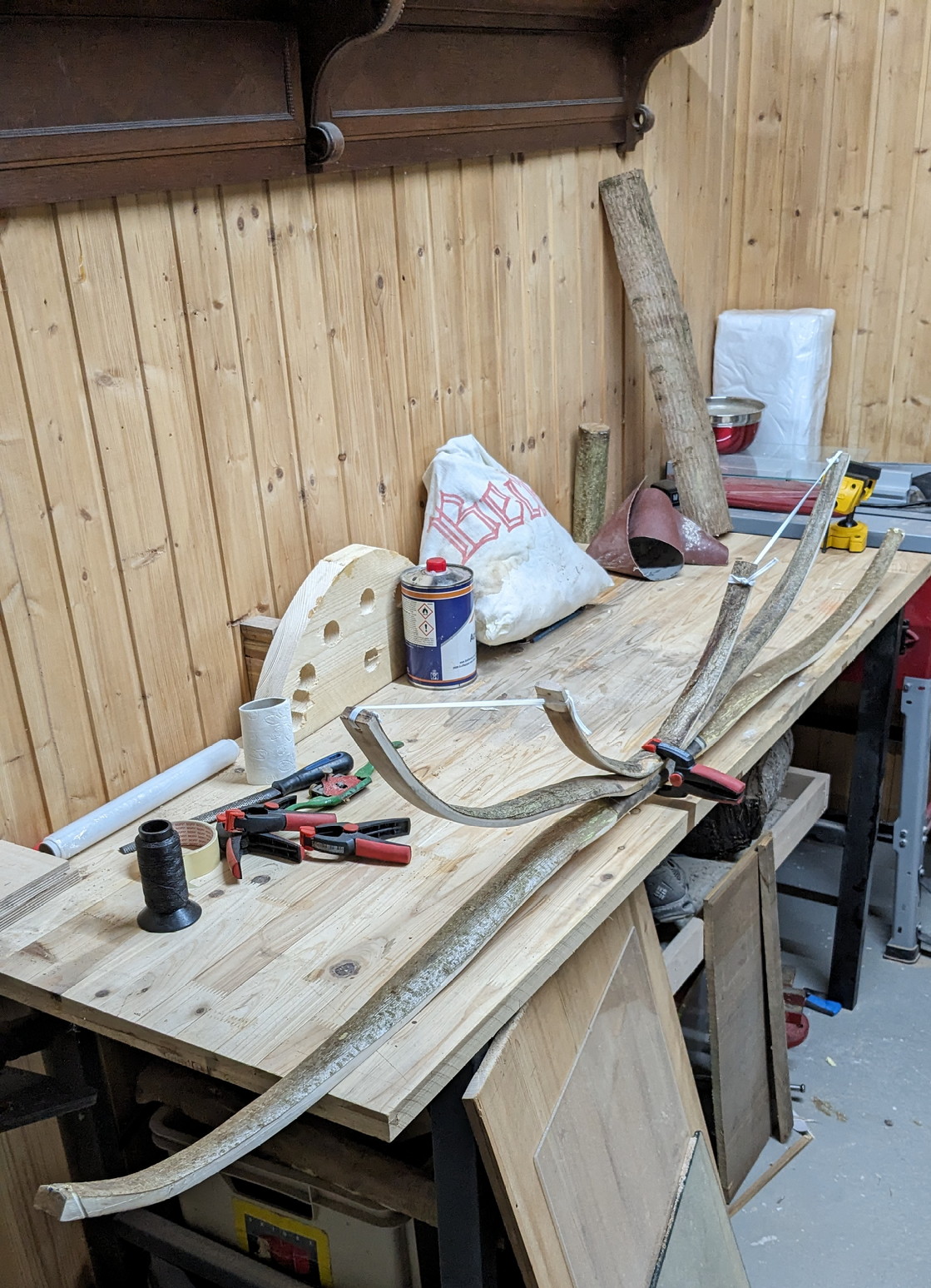 Ich habe vor, die Bögen nicht fix miteinander zu verbinden, sondern jeweils ein Kabel von Nocke Hauptbogen zu Griff spannen und die Tochter Bögen mit einer nach oben gerichteten V-Nocke einzuhängen. So können die Tochter Bögen dann frei unter dem Kabel hin und her rutschen.