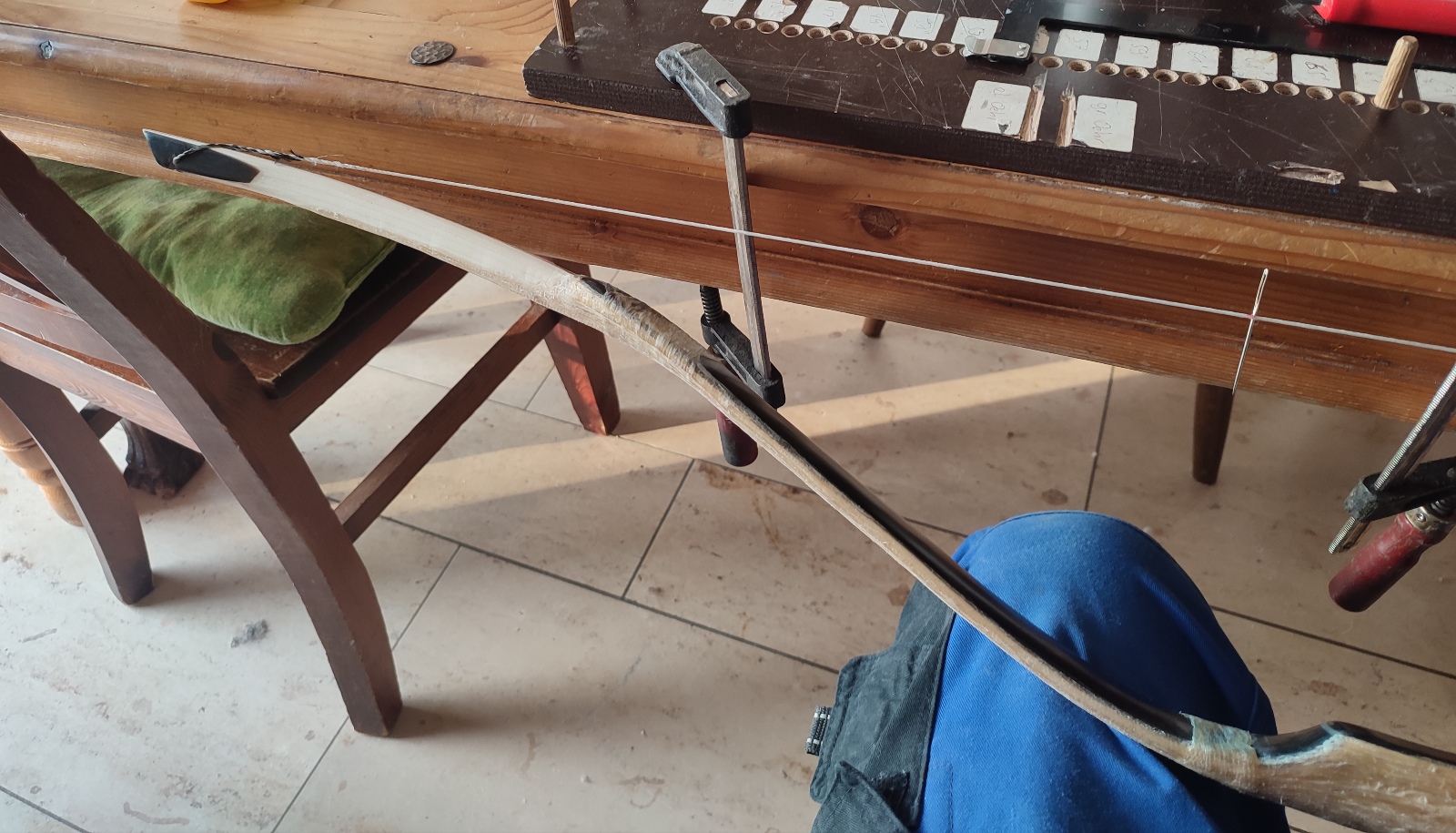 So heute wurden die Nocken schmaler geschliffen und Hornplatten vorbereitet, die an die Seiten kommen. Er hat sich schön wieder Reflex gezogen und hat hat jetzt 17,5cm über dem Griff. Ich denke Morgen kann ich die Nocken und Siyahs endgültig Formen und die Sehne bauen....