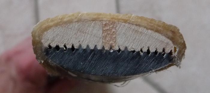 Nein Nein, das Problem waren nicht die unpassenden Zähne. Wenn ich mir die Bruchstellen so anschaue ist nicht der komplette Wurfarm unpassend. Es gibt einen Übergangsbereich zwischen unpassend und passend. Ich glaube in genau dem ist der Bogen gebrochen (ganz sicher bin ich nicht weil ich das Stück nicht mehr finde). Vielleicht weil die Rillen sich dort gekreuzt haben und damit der Holzkern zu stark beschädigt war. Schwer zu sagen. Aber ich denke es wäre natürlich wesentlich besser, wenn, wie du sagst, die Hohlräume mit Leim gefüllt wären.