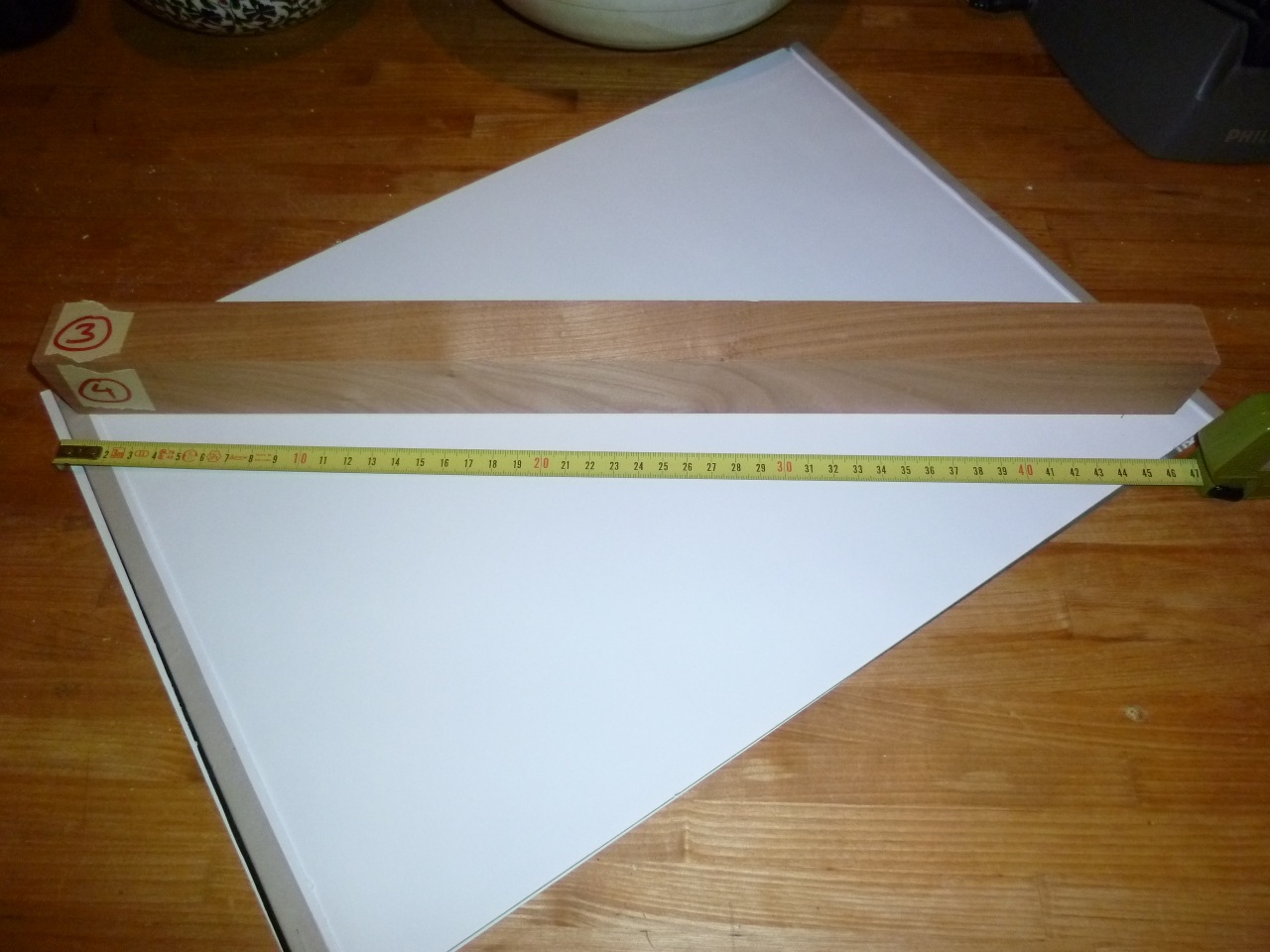 Heute war wieder ein Päckchen In der Post. Das schlechte Stück Kirschholz hat der Händler gegen ein etwas weniger schlechtes getauscht. Die Jahresringe laufen wieder schräg aus dem Holz raus, aber beim Griff dürfte das nicht so wichtig sein, oder? Jetzt überlege ich, welche 33cm ich von den 47 verfügbaren für den Griff rausnehmen soll, bzw mit welcher Seite nach oben ich das Kirschholz auf einen Streifen Ahorn laminieren soll.
