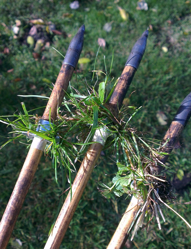 die Schäfte sind ungekürzte 32'er da haut das mit meinem Auszug noch ganz gut hin. Meine Hoffnung wäre das durch die Haken der Pfeil erstmal Gras aufsammelt und so an Geschwindigkeit verliert bevor er sich in die Erde bohrt. Wegen Bruchgefahr wird besonders durch das Zusatzgewicht die Nock stärker belastet. Alles Probleme die man nicht hat wenn man gut trifft
