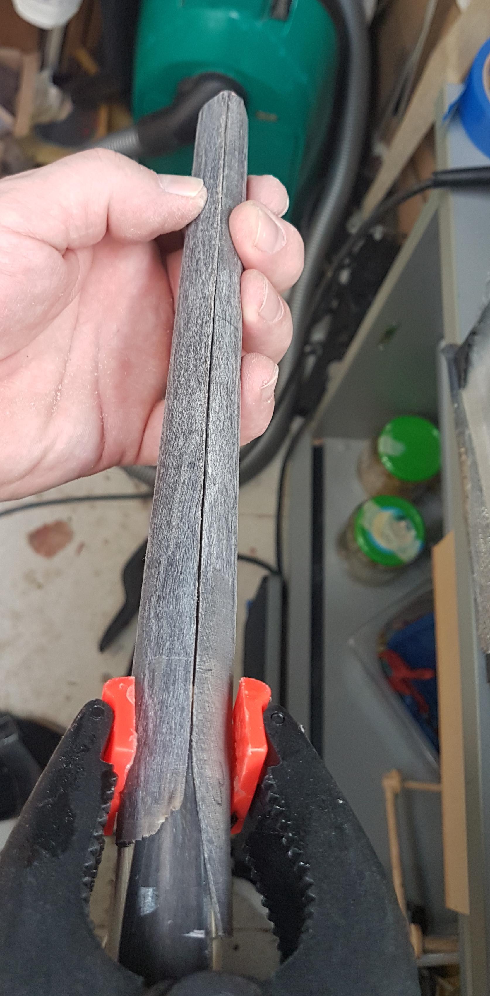 Dann habe ich die Bruchstelle bis auf den Grund des Risses ausgeschliffen und ein Patch mit sehr ähnlicher Rückenwölbung hergestellt, ich habe ja noch die 2te Hälfte des Stämmchens :)