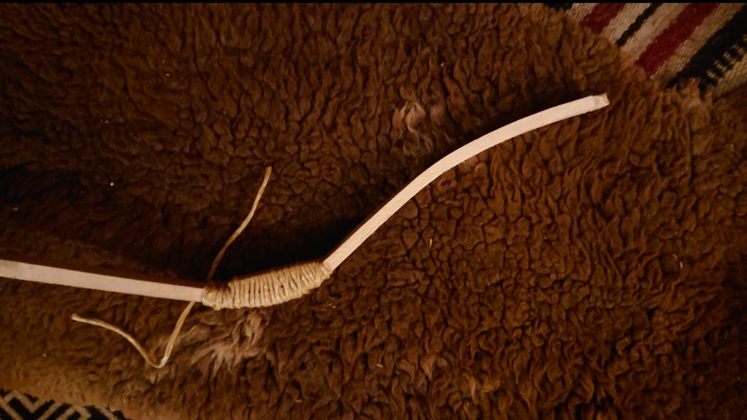 Ich habe am Testbogen, der mittlerweile trocken ist, ein Stück Eibe eingepasst und mit Paket Schnur umwickelt...