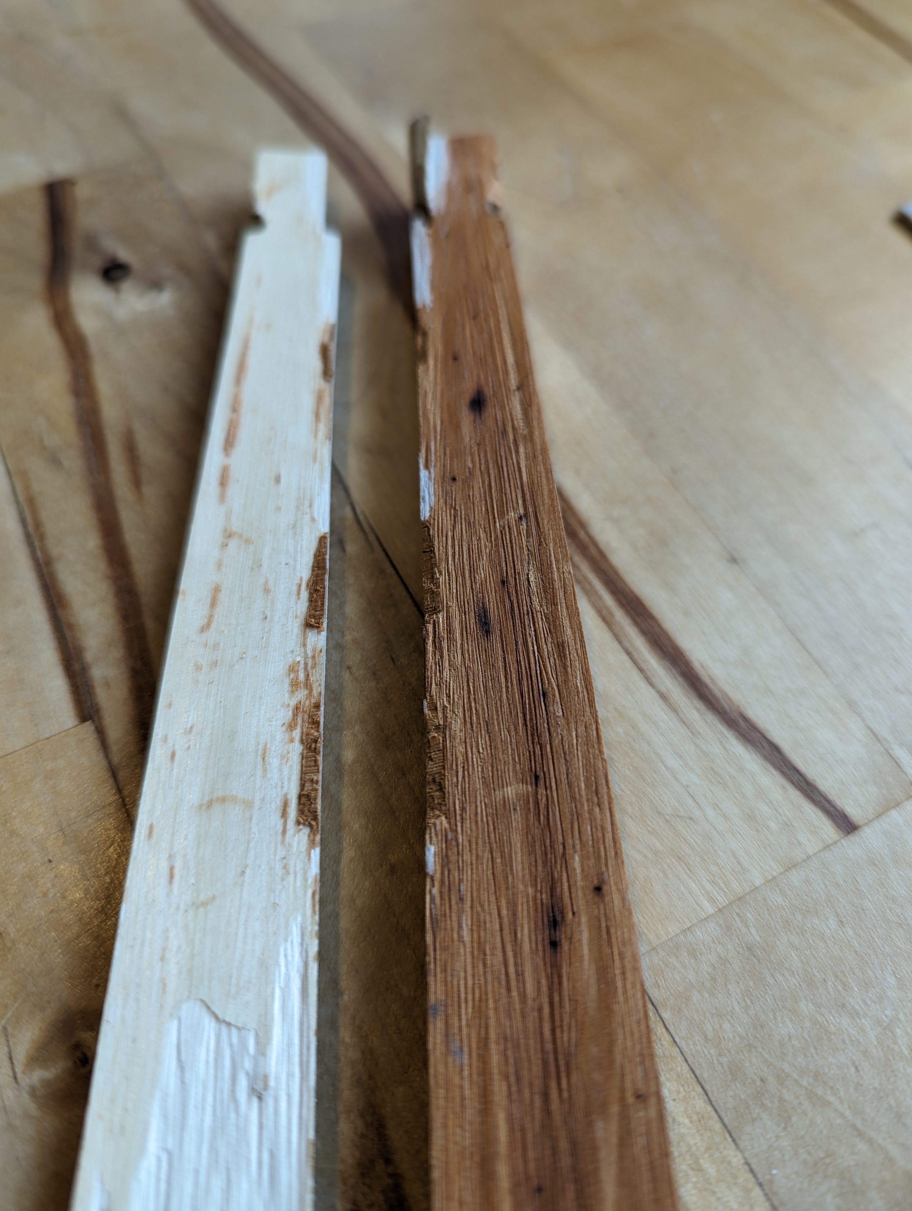 Die Klebung war nicht gut, sieht mir nach zu wenig Kleber aus, aber die Eibe sieht auch sehr, sehr spröde aus.