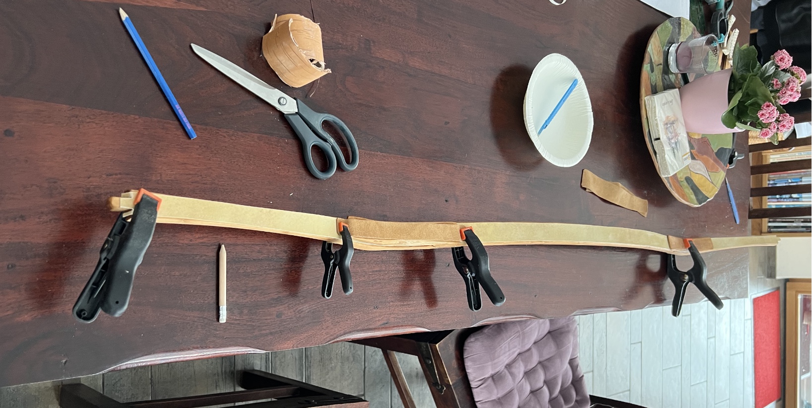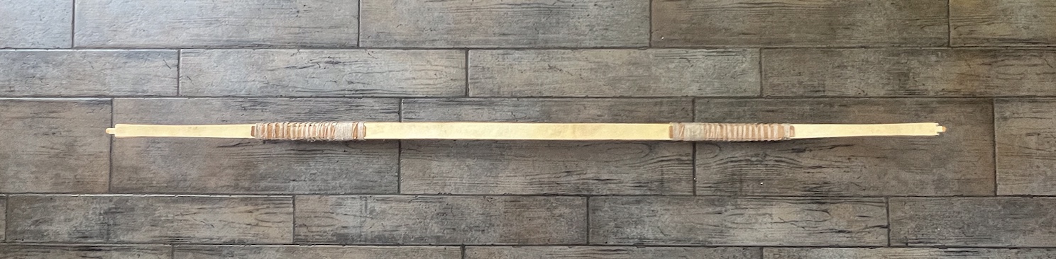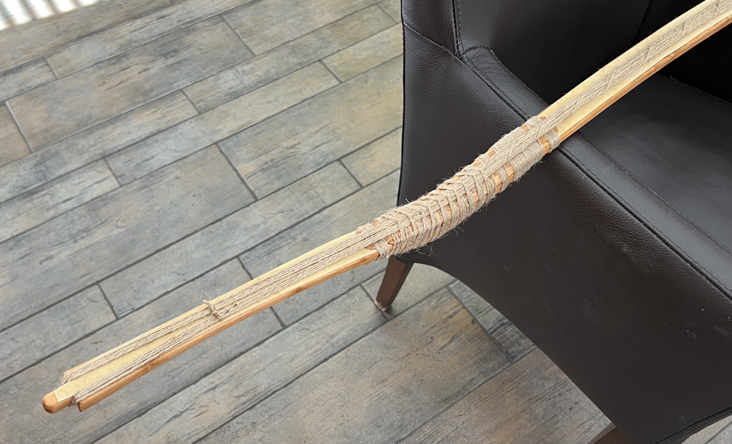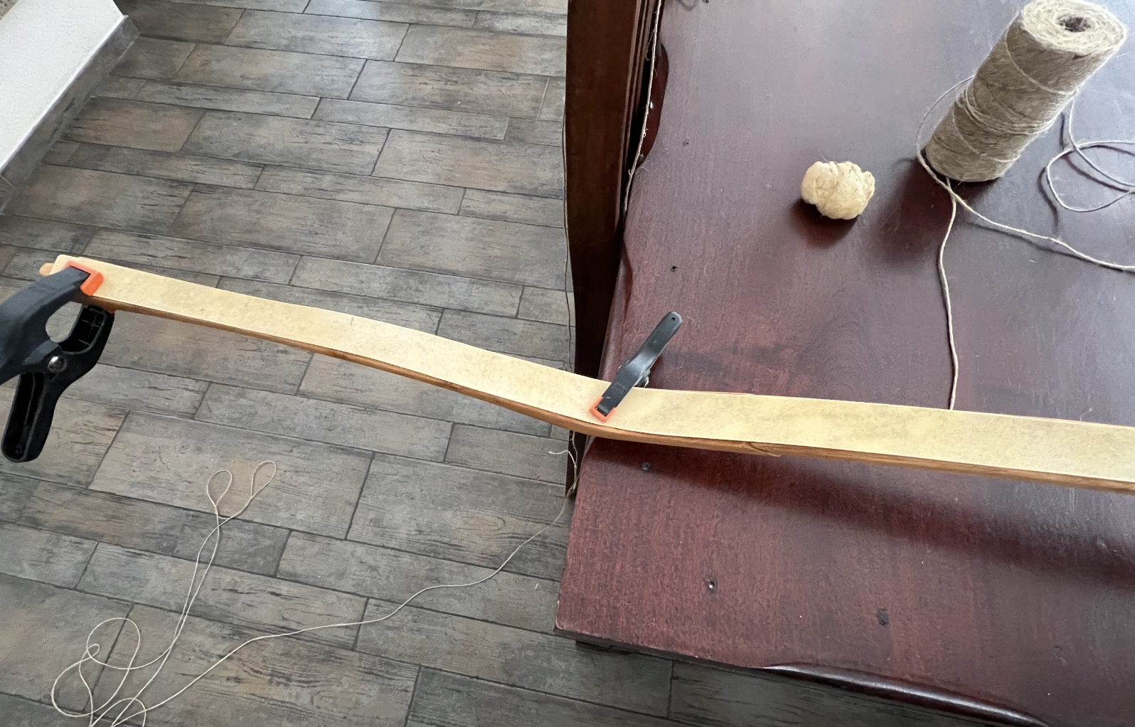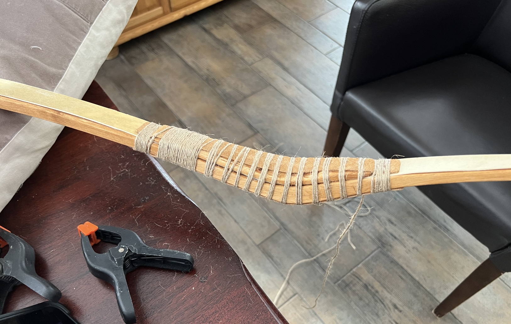 Heute alles zusammen gesteckt, Rohhautbacking drauf, Knieverstärkungen und Lederstreifen mit Klemmen fixiert, alles lose, alles fliegt herum, ich glaube die Inuit hatten auch Klemmen aus Walbarten, oder sie hatten eine Frau die gerne geholfen hat und nicht herum gemeckert hat: warum muss das alles am Esstisch passieren, dann der gewachste Juteschnursalat und die Auflösung, 28 Stränge, 8 über die gesamte Länge, 20 von Knie zu Knie, damit das Kabel die Rohhaut gut anpresst, braucht der Bogen die deflexen Bogenabschnitte. Jetzt noch die Griffwicklung aus einem Rohhautstreifen und eine Sehne anfertigen, welches Sehnenmaterial ich nehme, weiß ich noch nicht. Ich glaube, die Inuit haben Fastflight genommen.