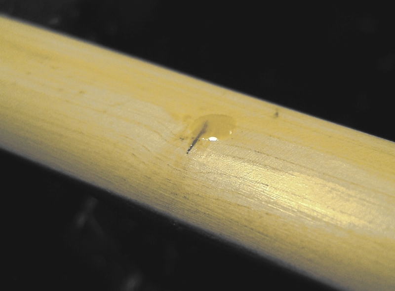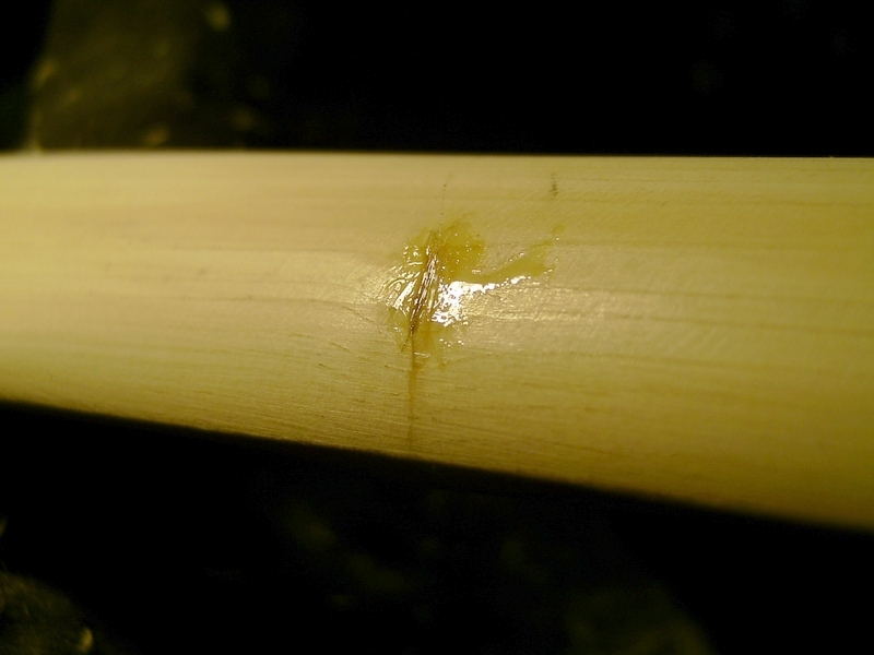 Zuerst habe ich das Holz mit Heißluft vorgewärmt, dann einen Epoxi-Klecks an den Rand des Schlitzes gesetzt.