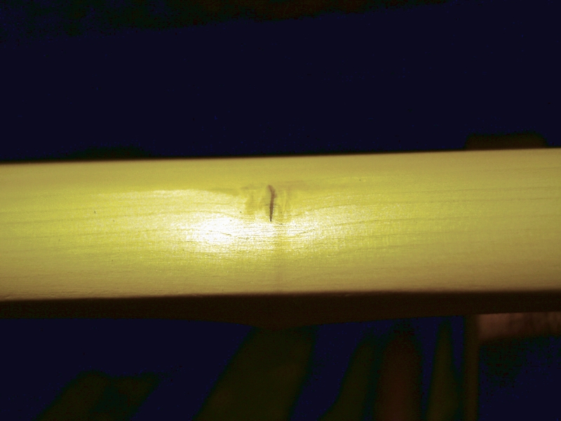 So zeigt er nun an einer anderen Stelle (10 cm entfernt), ausgehend von einer Zweignarbe, einen Kompressionsbruch: