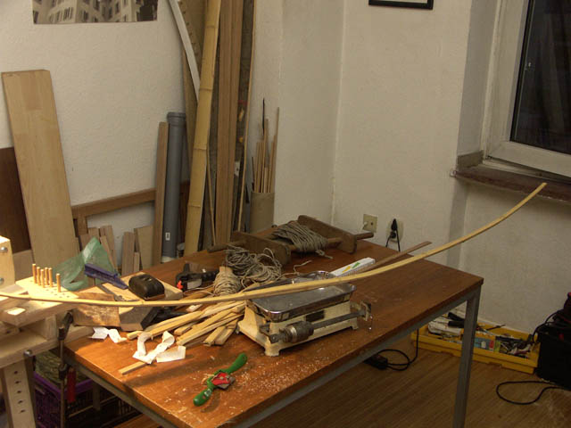 ich hab in letzter Zeit die Gattung Bogenköcher lieb gewonnen und wollte auch beim Lanbogen nicht darauf verzichten müssen. Deshalb hab ich aus den Bruchstücken meines verunglückten Massa/Bambus-Bogens für meinen momentanen Ipe´/Bambus-LB einen Bogenköcher gebaut. Die Schaftbefestigung funzt via hartem Keilriemenleder, die Spitzenbefestigung via Magnet. Aufgehängt hab ich das ganze an nur einem Punkt unmittelbar unter dem Griff. Hält alles wie Sau!