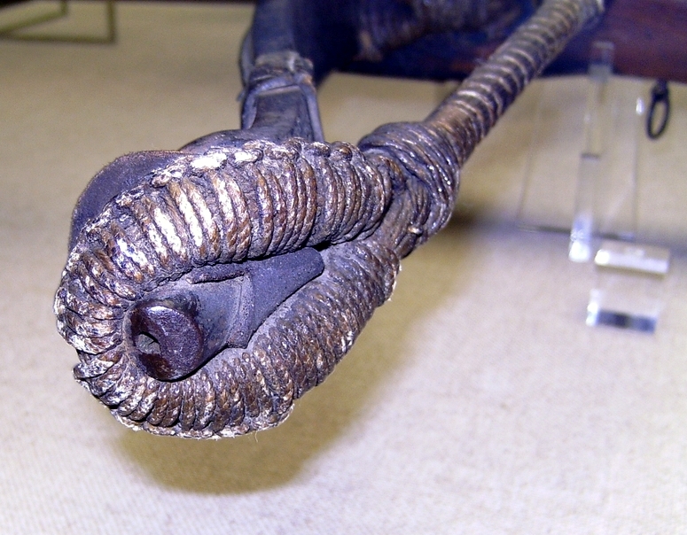Nuss aus Horn und zwei Stifte zum einhängen einer Winde in der Säule. Ich gehe davon aus dass da mehr als 200lbs zum ziehen waren.Die Shene die an der rechten Armbrust zu sehen ist, gehört eigentlich zu der Holzarmbrust. Leider hat da wohl jemand diese verwechselt, sowie den Auslösehebel entfernt.